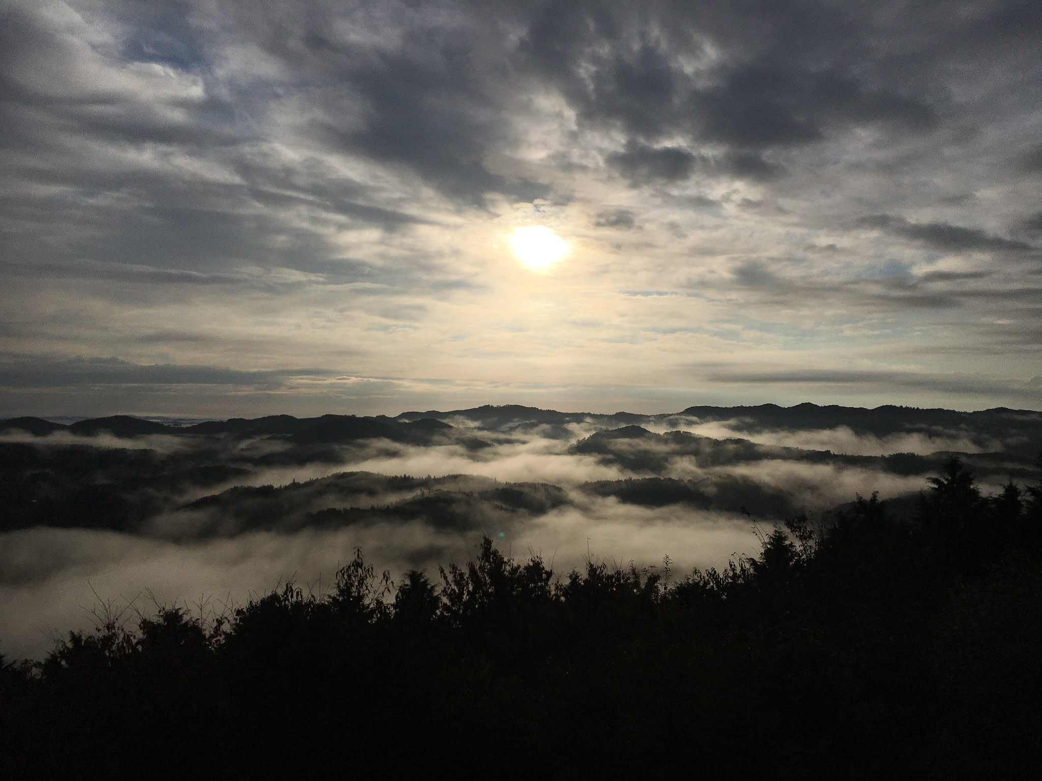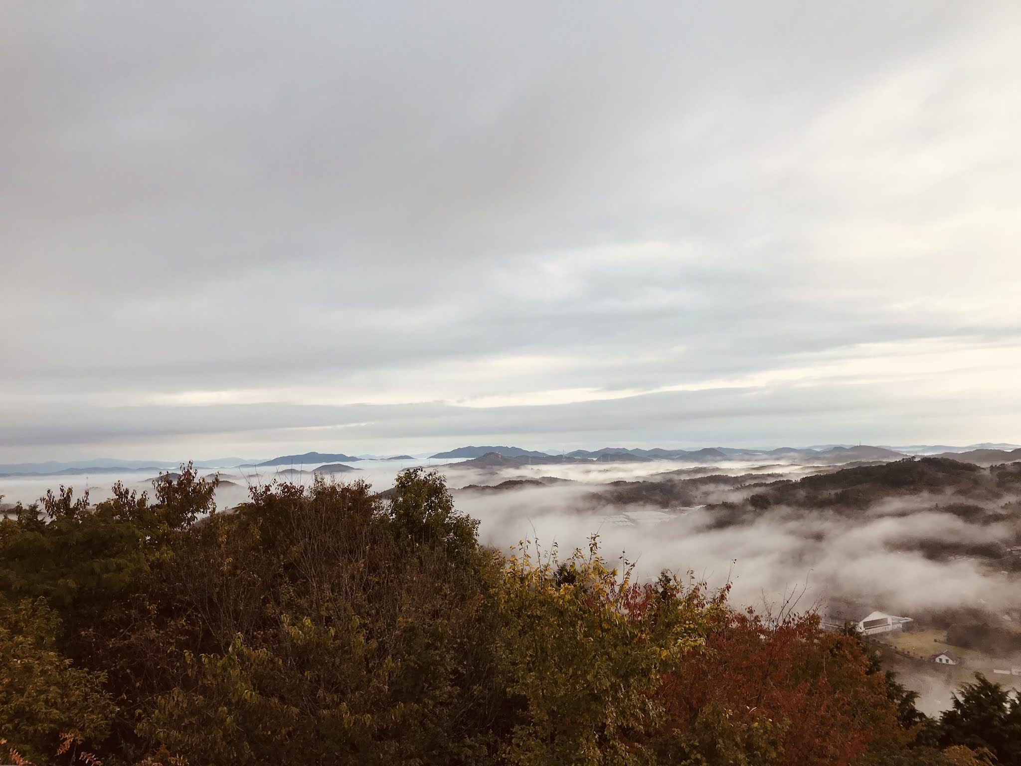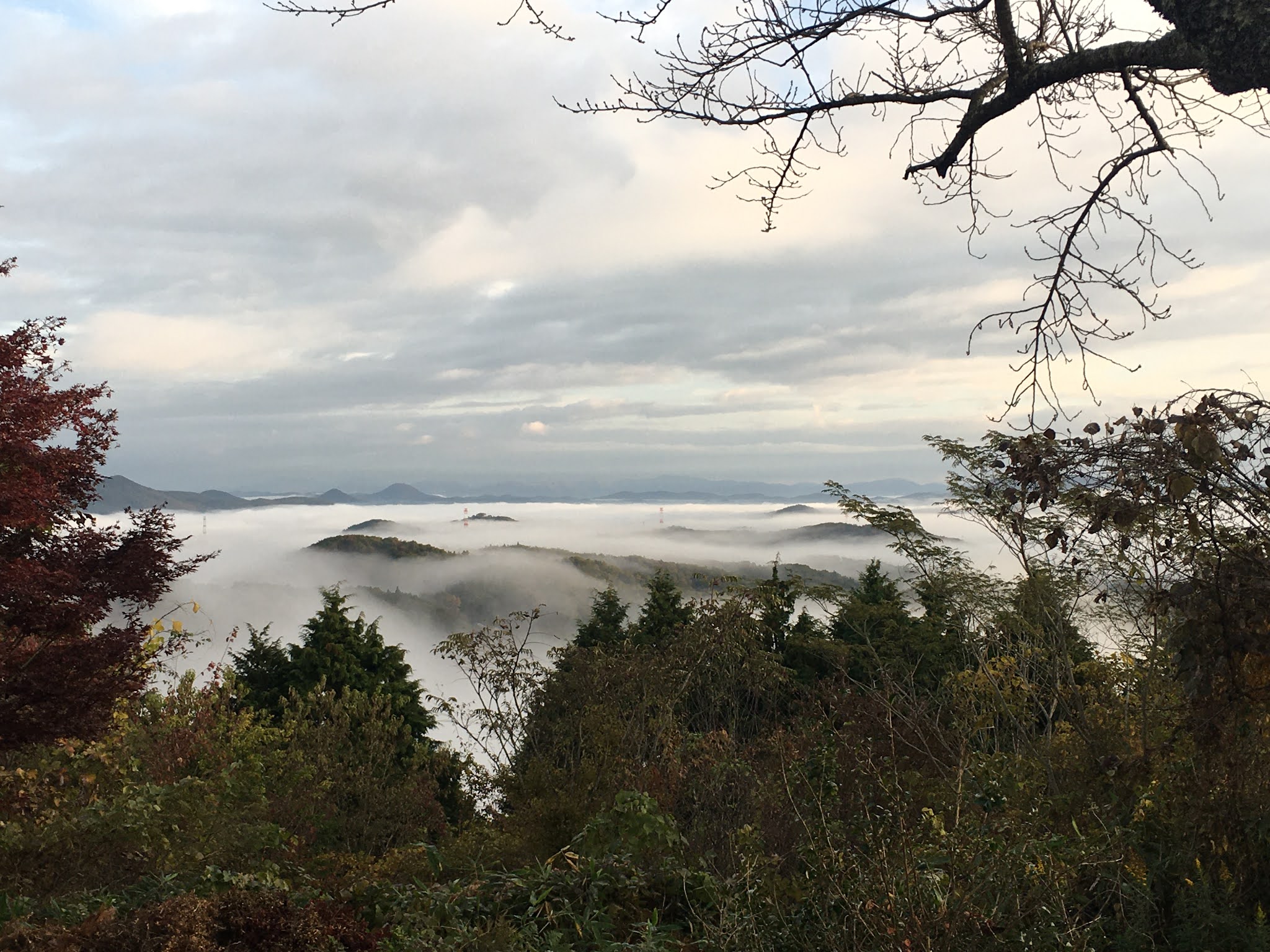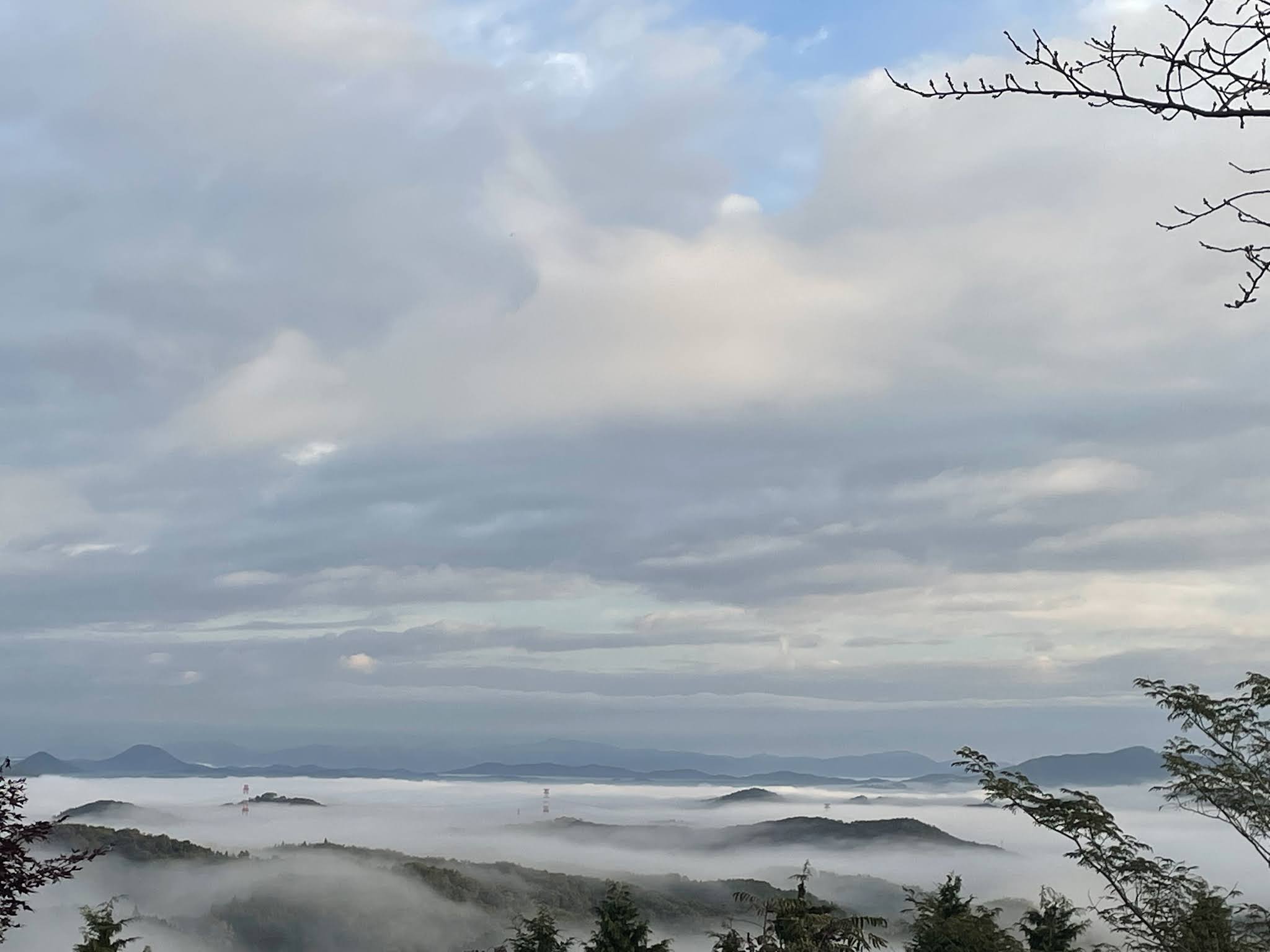 早上不到六点半起来,出发去恋人之圣地看云海,那是米见山,海拔不到700米,我们大概7点到。开车十多二十分钟。最后一段路比较窄,不过当时也没对头车。今天是平时,山上除了我们还有一辆车。
