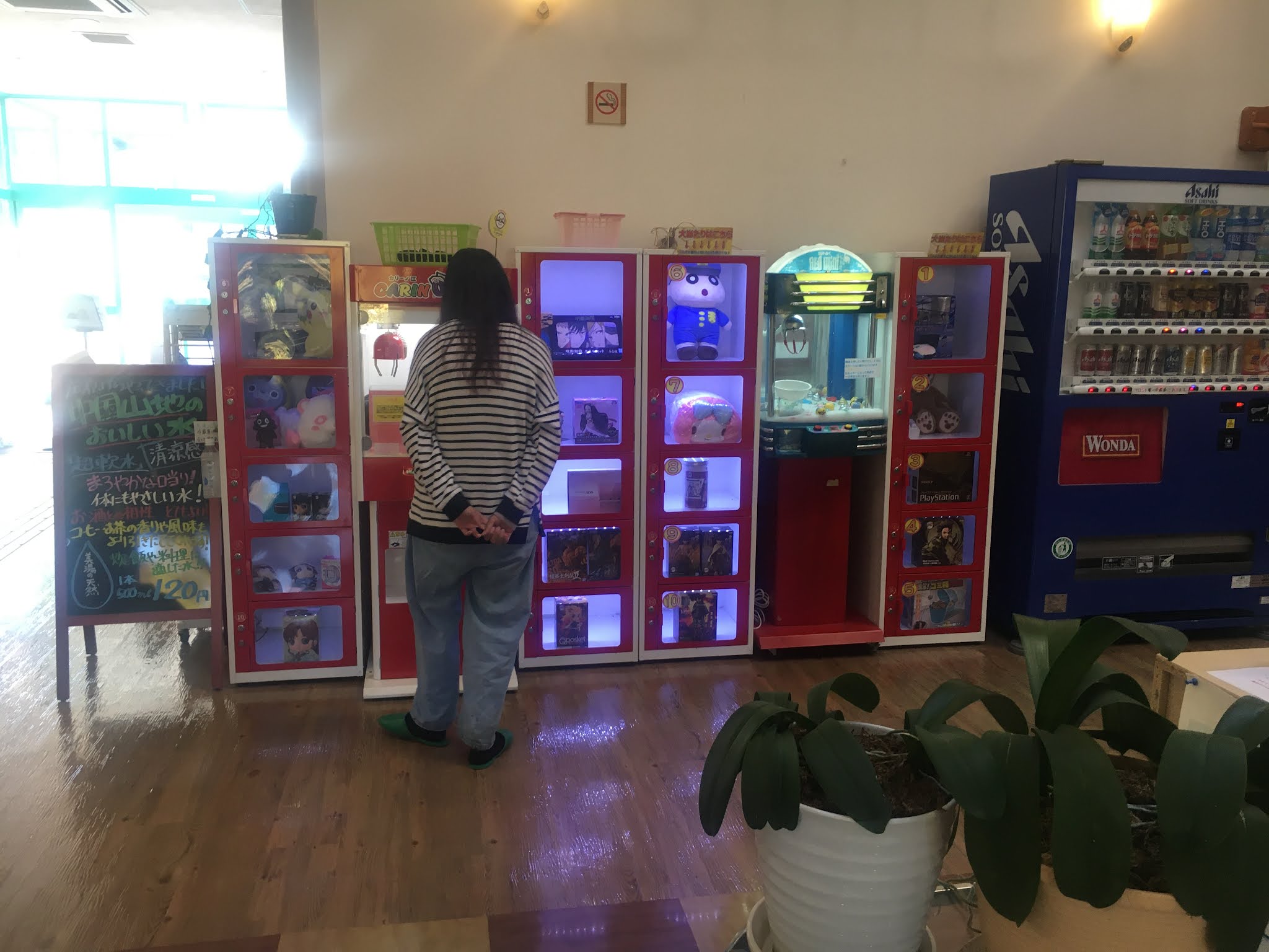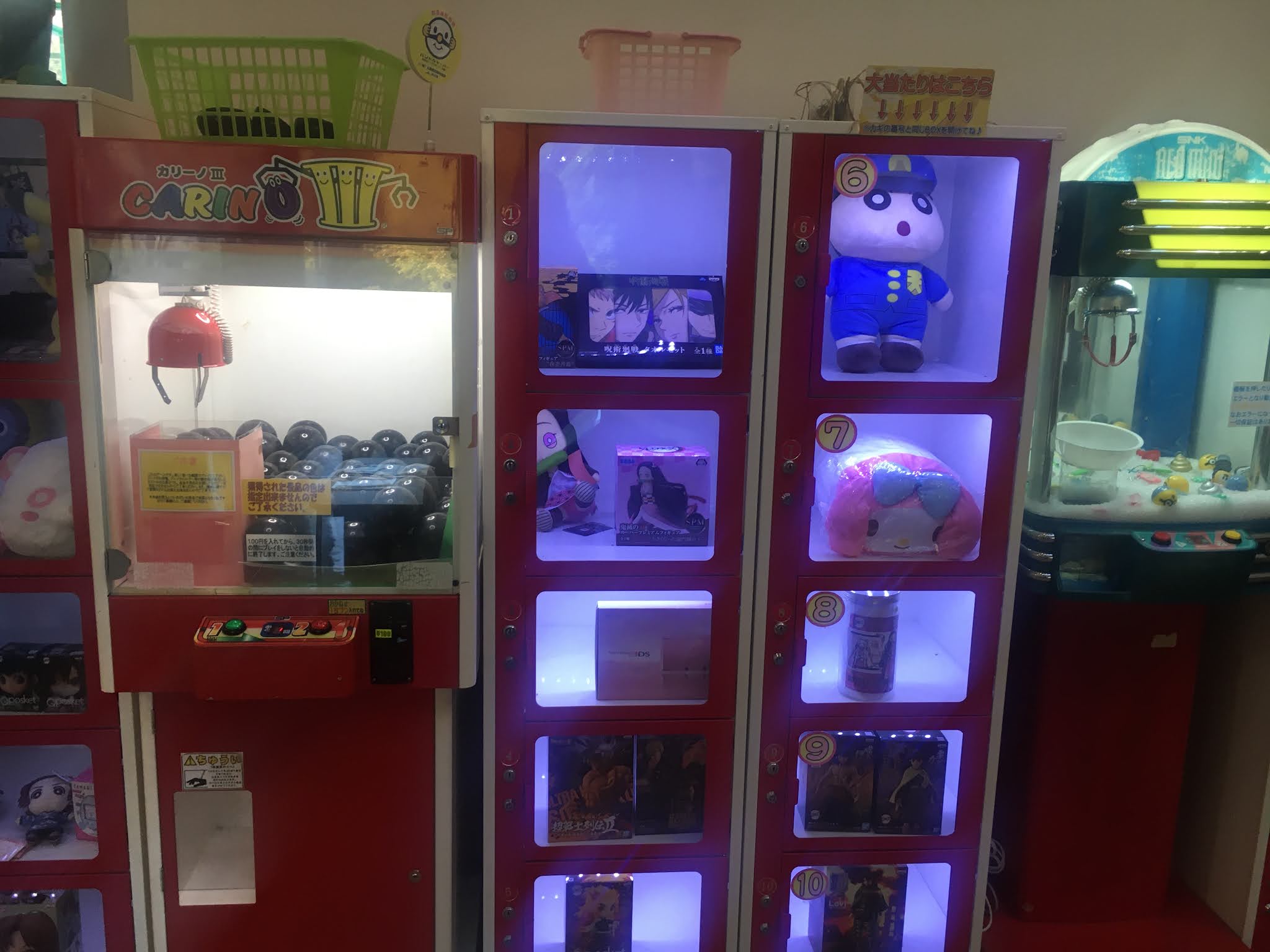 我发现这里放这个夹娃娃的机器实在是个陷阱。当我在等小伙伴的时候,看到礼物很吸引就越看越想玩了,投了100日元进去,发现是极其难的。