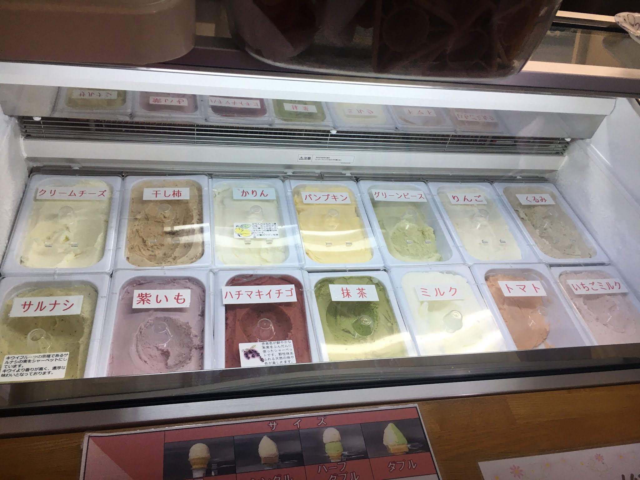 泡完热乎乎的温泉,最适合的就是吃冰冻的冰淇淋了。从温泉开车约10分钟到,在路边一个自家制的小店,有牧场。当时一边吃一边听到牛叫一边闻着牛粪吃,我们当然吃了サルなし。这里的味道很多,很特别,都很好吃,不过我们都一致推荐柿子(干し柿),有很浓柿饼的味道。我们吃的两个球500日元。