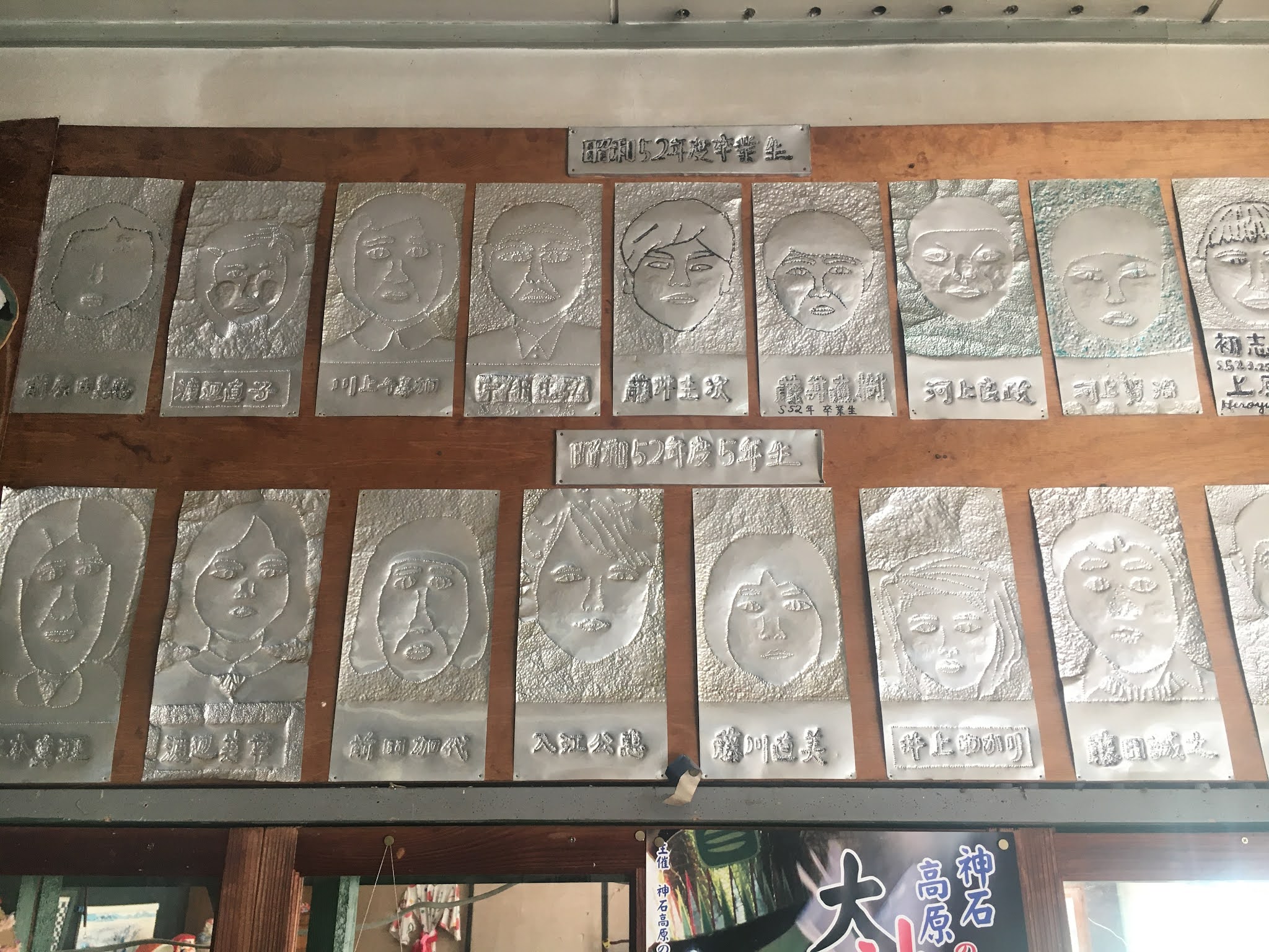 上面好像锡箔纸的东西是刻了1979年毕业生的头像和名字。大概那个时候相机不流行,他们就用这个方式记录。