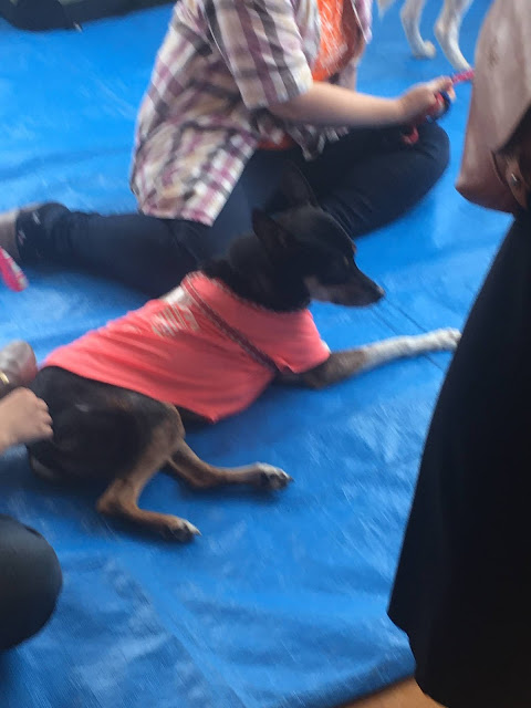 吃饭的时候有人带狗进来。那只狗走过去跟taotao玩,还把舌头伸出来,吓死我了。我让taotao拦住他,不要让它过来。不过后来我在raku老师陪同下去摸它了。