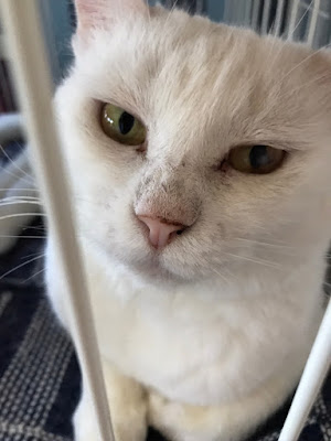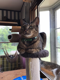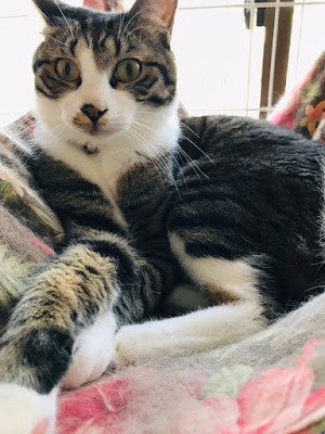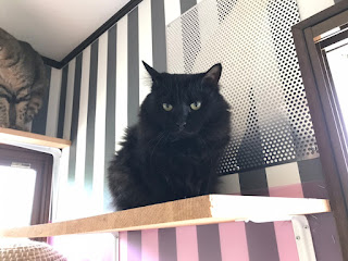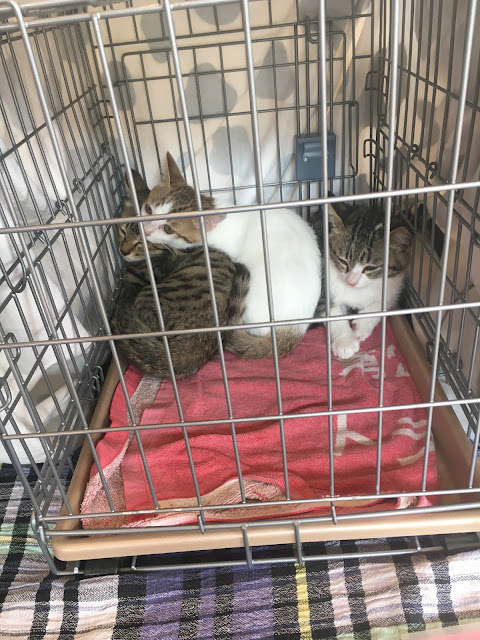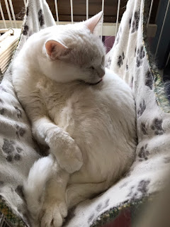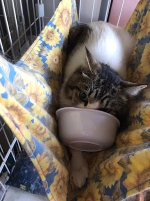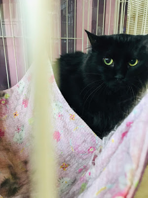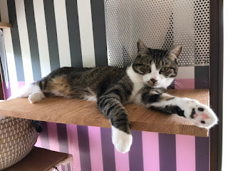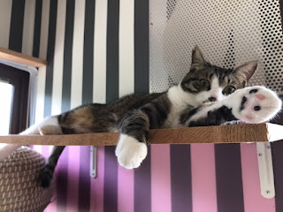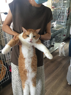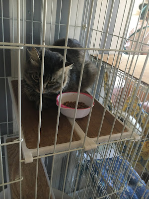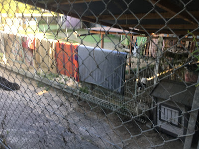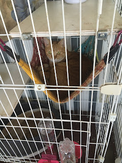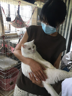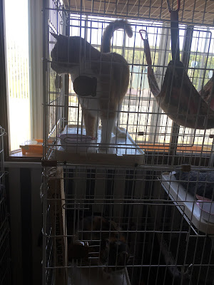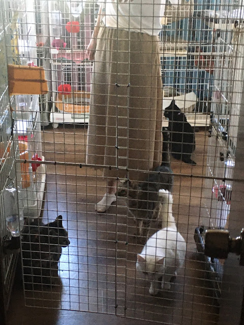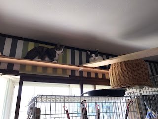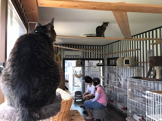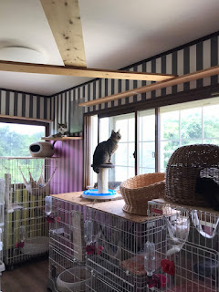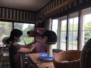 很快它们吃饭了,小谷女士把它们放回笼子里,我可以进去了。它们每个住的地方是固定的,有的是独立间,也有三只猫一间,它们甚至可以好的三个同睡一张吊床。