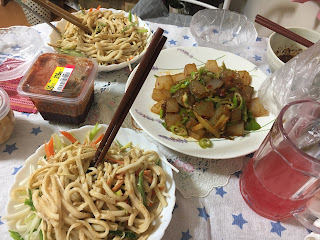 我们的晚餐,中间的是河南炒绿豆粉,配大葱很好吃的