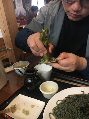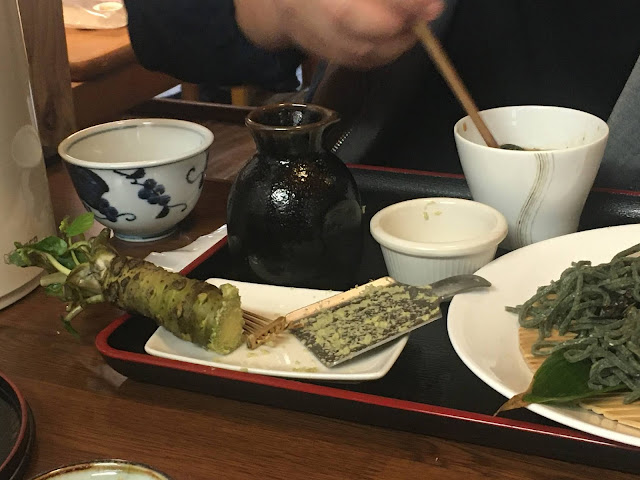 这个是日替的(900日元),左下是新鲜山葵,现磨来拌面吃。现在请onion学长来示范一下如何磨山葵。