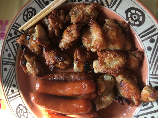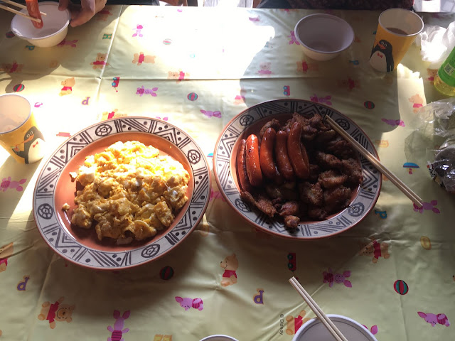 逛完我们先回去吃早饭了,当时8点半。回去后onion学长主动说他来做(他大概嫌我上次做的不好)。他确实做得不错,鸡剪的脆皮的。