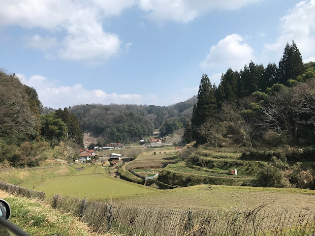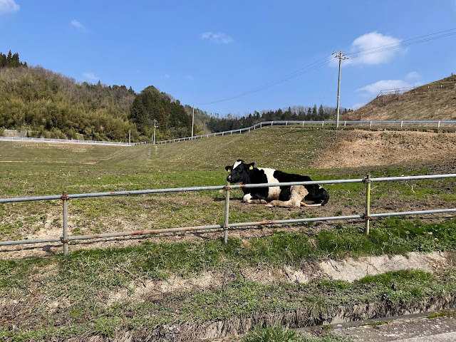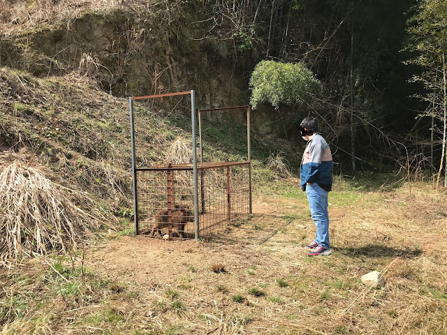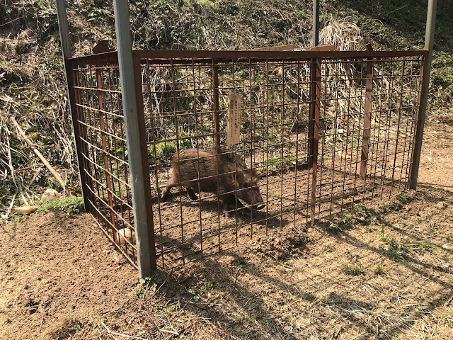 我们准备去出云三成那边吃午饭及看梯田,应该半小时左右能到,不料中间在农村车开错了,去了一条路前路被堵住。往回走期间,眼神很好的onion学长看到笼子里有动物,一开始以为是狗,细看原来是野猪!我第一次亲眼见野猪。它是被机关捕获的,估计很快就会进村民的肚子。