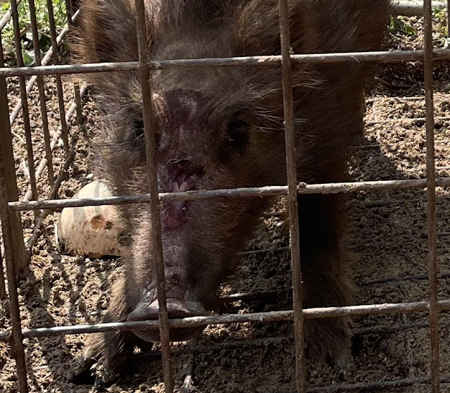 当时忘了拍视频,野猪的确很猛。一直往笼子冲,鼻梁都伤了,我放大给你们看看。