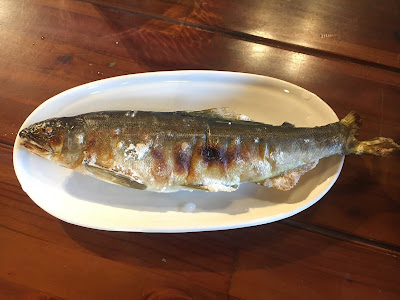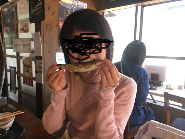 raku老师看到鮎鱼(あゆ),说很好吃,我们每人都点了一条,500日元,现烤的。