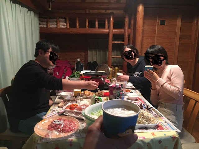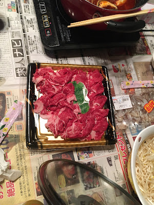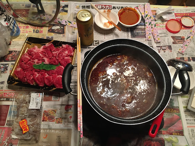 我们喝完要去隔壁超市了。因为这次有onion学长在,打破了我“每人100克肉”的惯例,变了每人200克,还有海鲜豆腐等...吃的饱不过没有吃撑。这次是那么多次出门晚饭吃的最好的,猪肉以前买100克100日元的,这次200,牛肉也是几百元100克的。还有可以做刺身的大虾,真的很丰富,我还带了全超市最贵的yebisu啤酒。今晚吃的很是尽兴。 不过吃之前,我们先看看大家的准备。