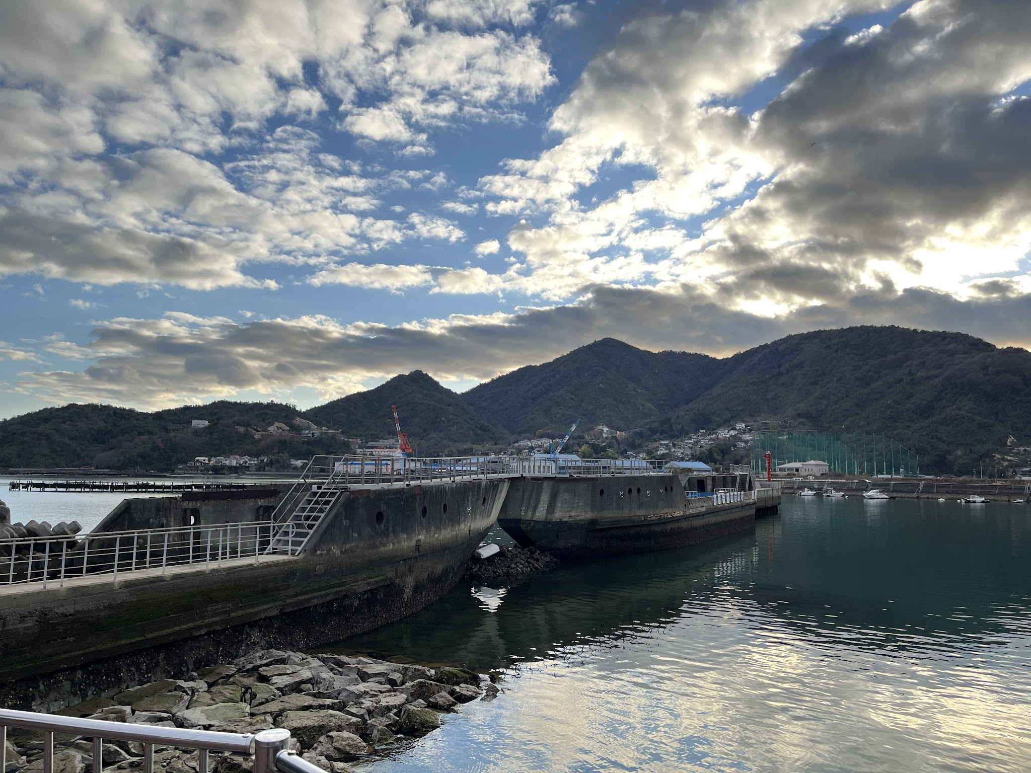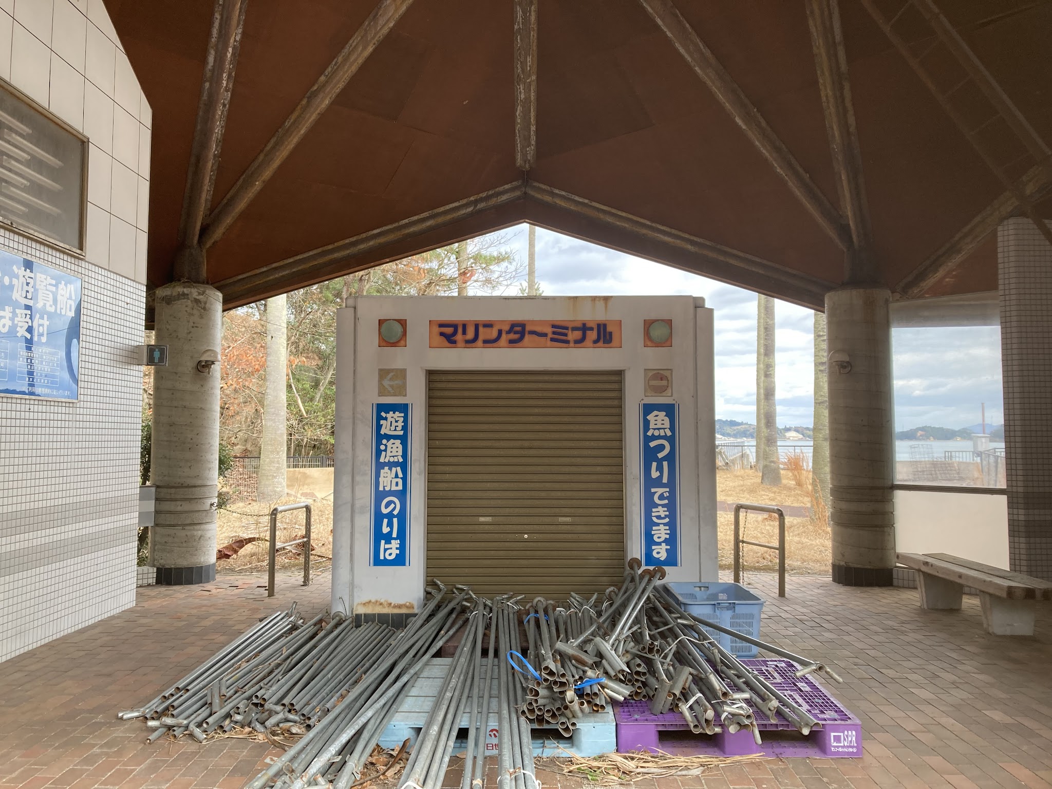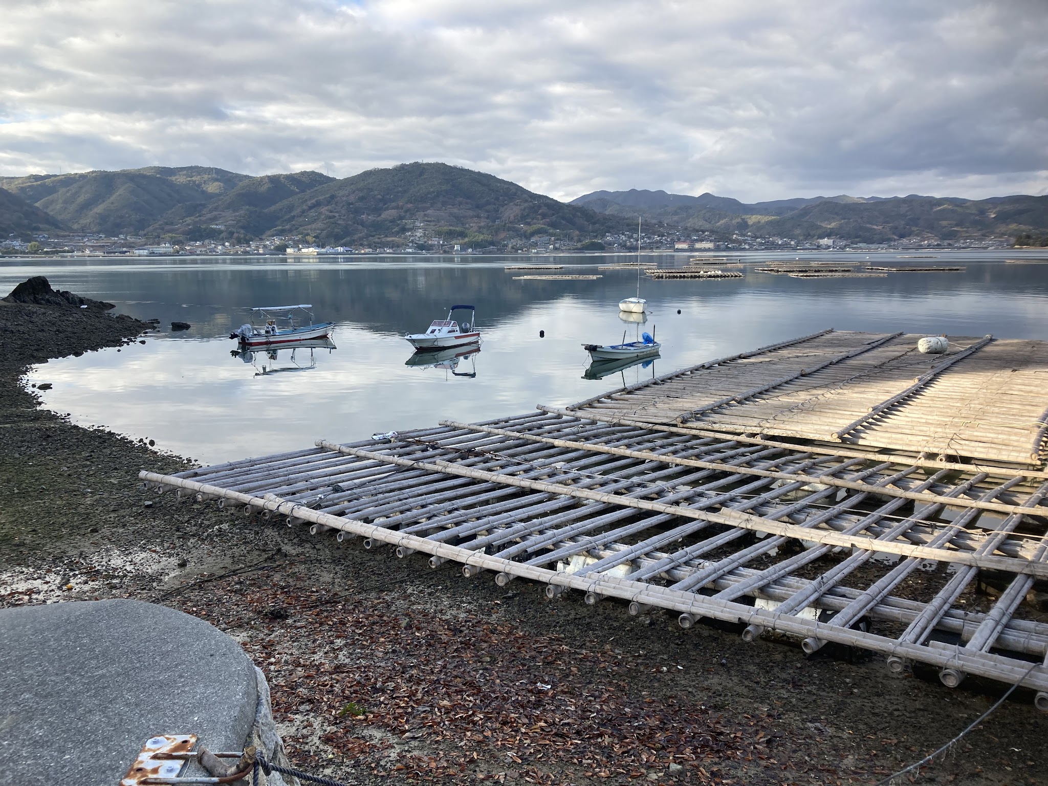 我们现在要启程到今天行程最后一站 - 二战遗迹武智丸。这里是牡蛎直卖的地方,不能随便停车的。不过今天没人,我们就违规停几分钟吧,要合法停车多走几步路有停车场的。