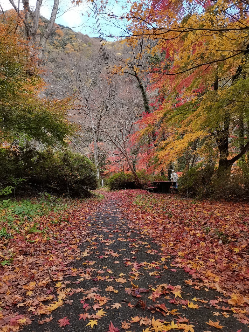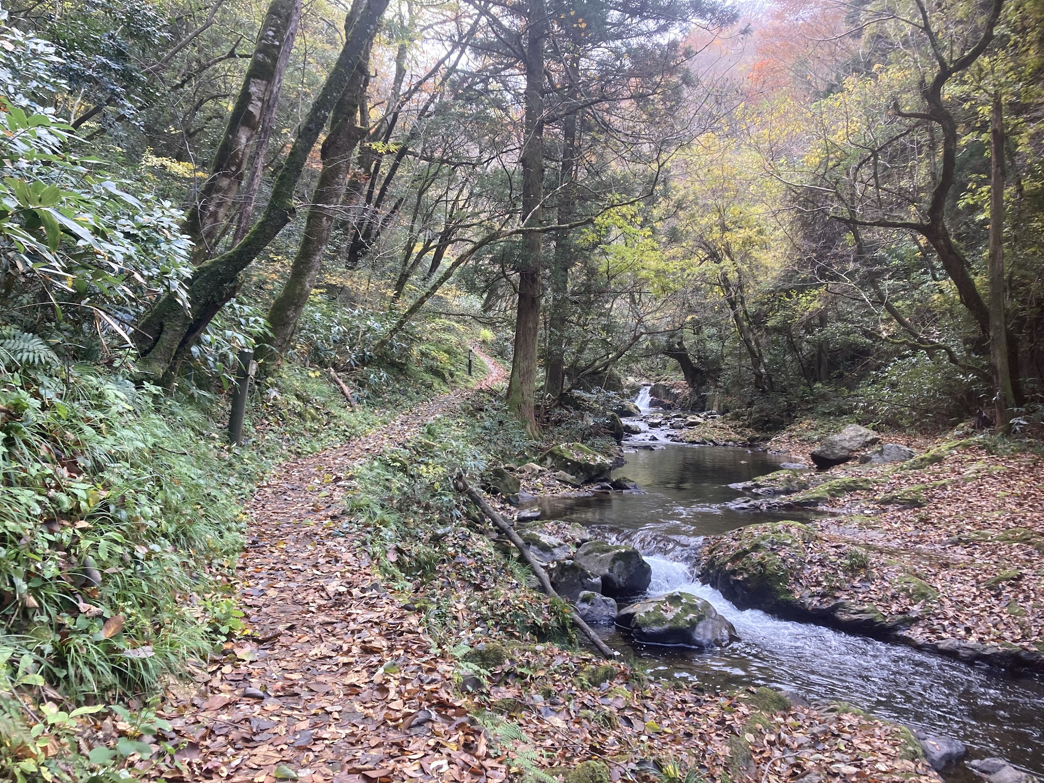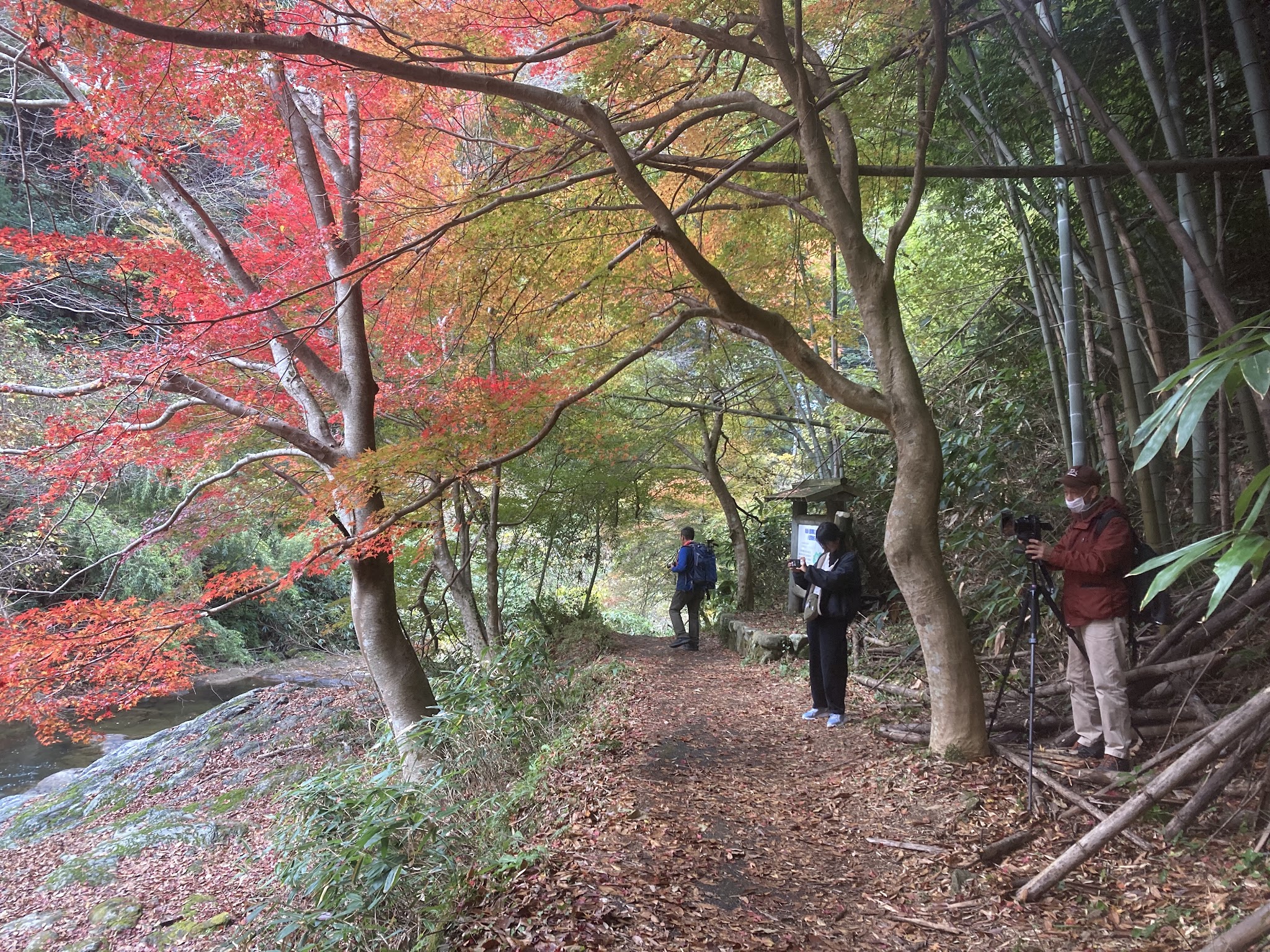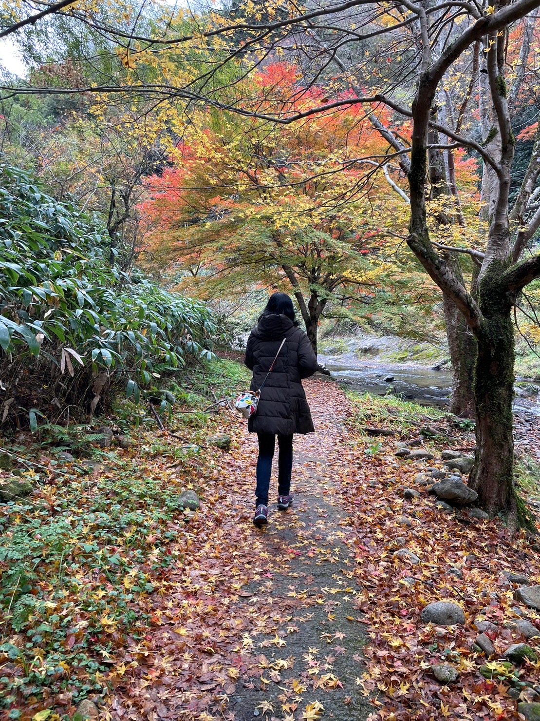 这里的路还算好走。有沿河的,不过部分封了,现在只有山侧的路。有时候要走些斜坡。我们在落叶下徒步很有意境。