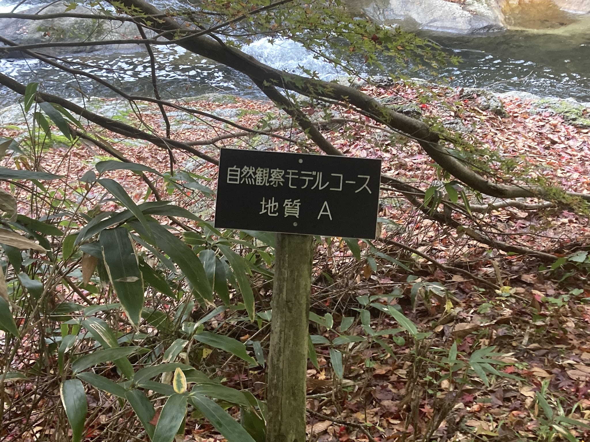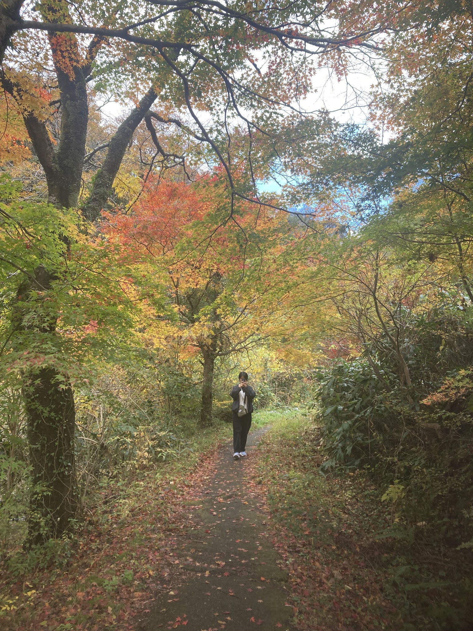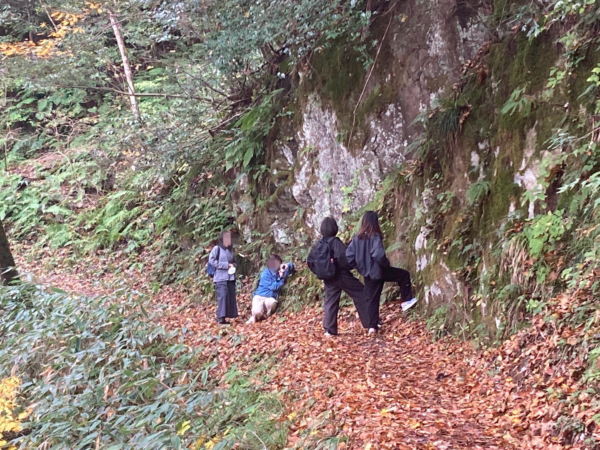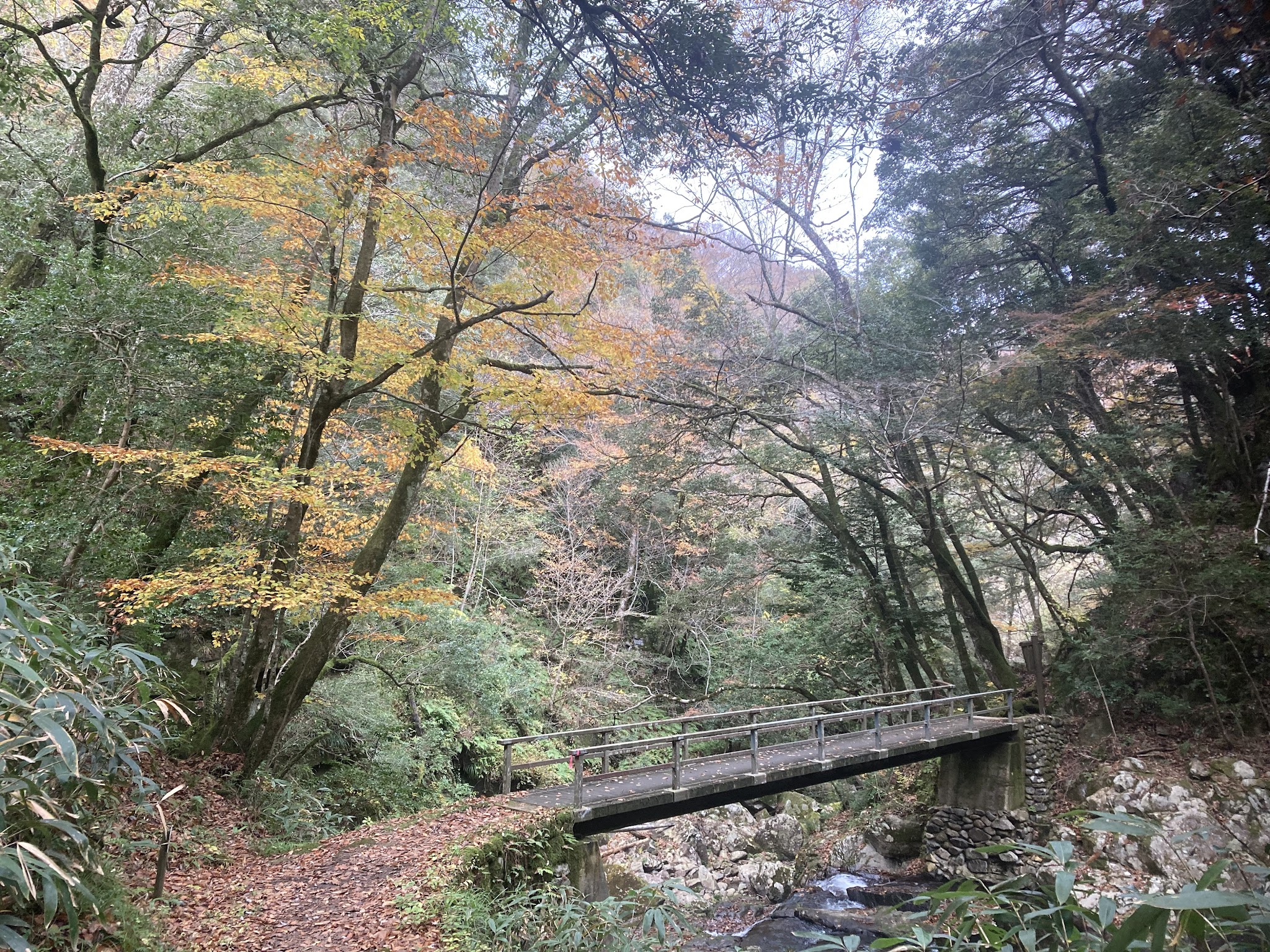 这里的路还算好走。有沿河的,不过部分封了,现在只有山侧的路。有时候要走些斜坡。我们在落叶下徒步很有意境。
