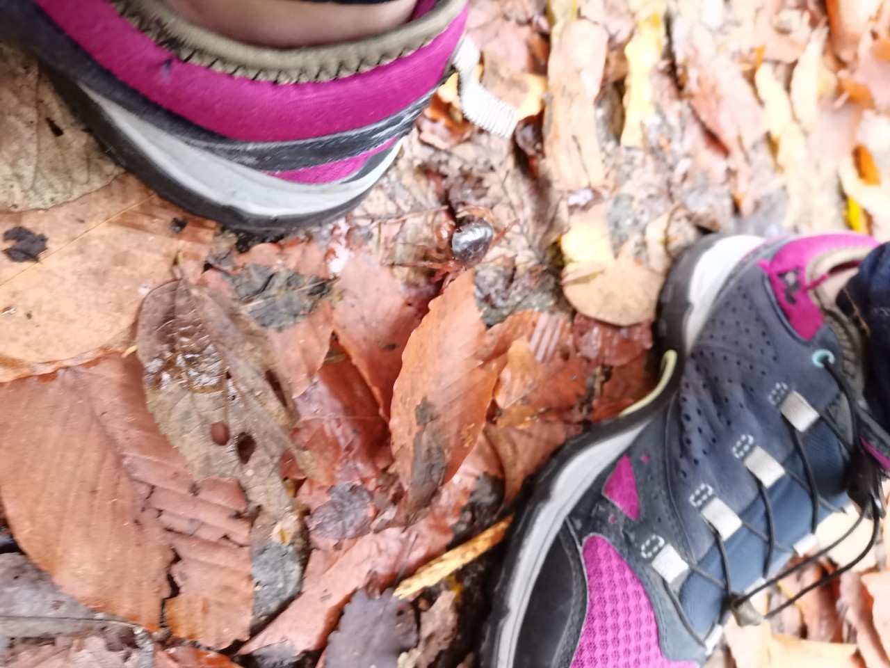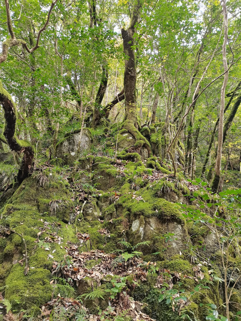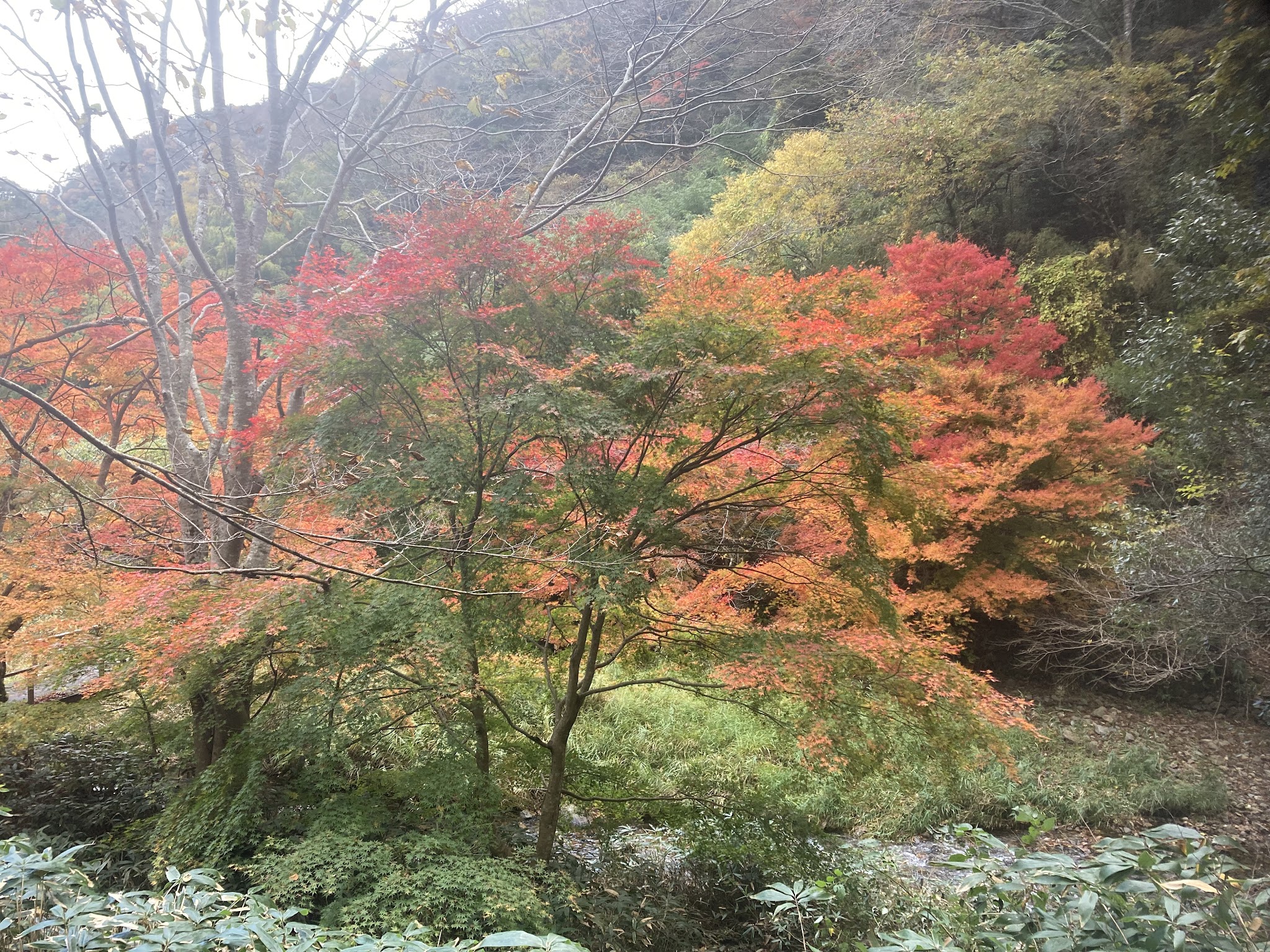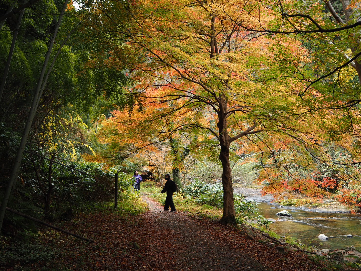 这里的路还算好走。有沿河的,不过部分封了,现在只有山侧的路。有时候要走些斜坡。我们在落叶下徒步很有意境。