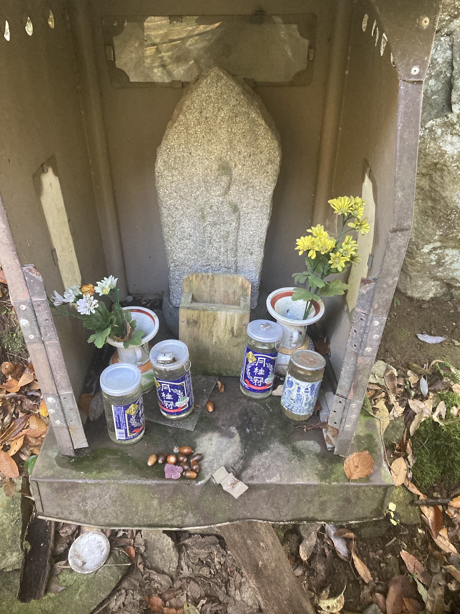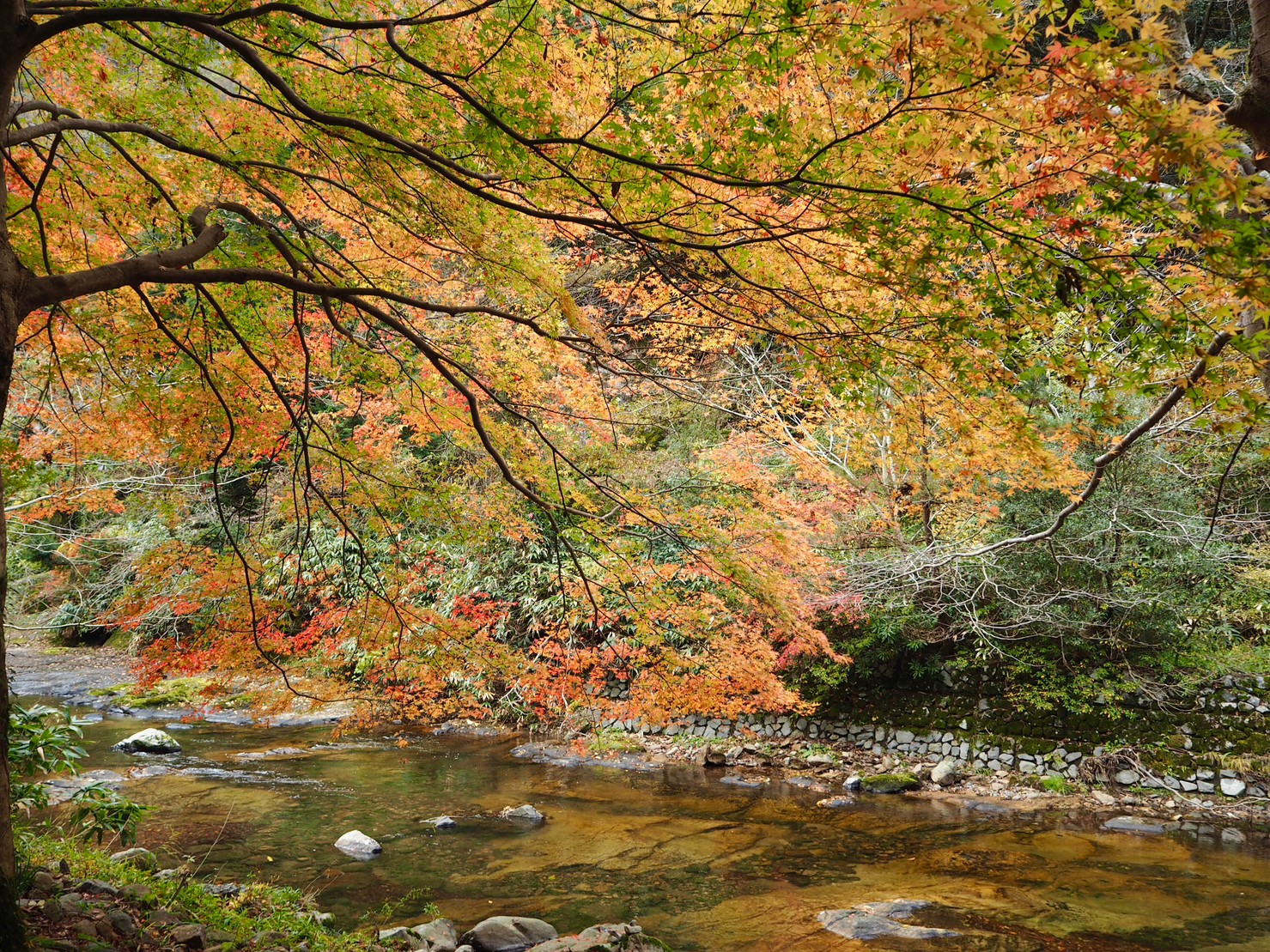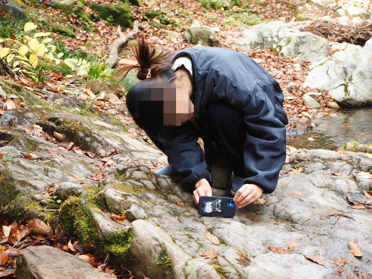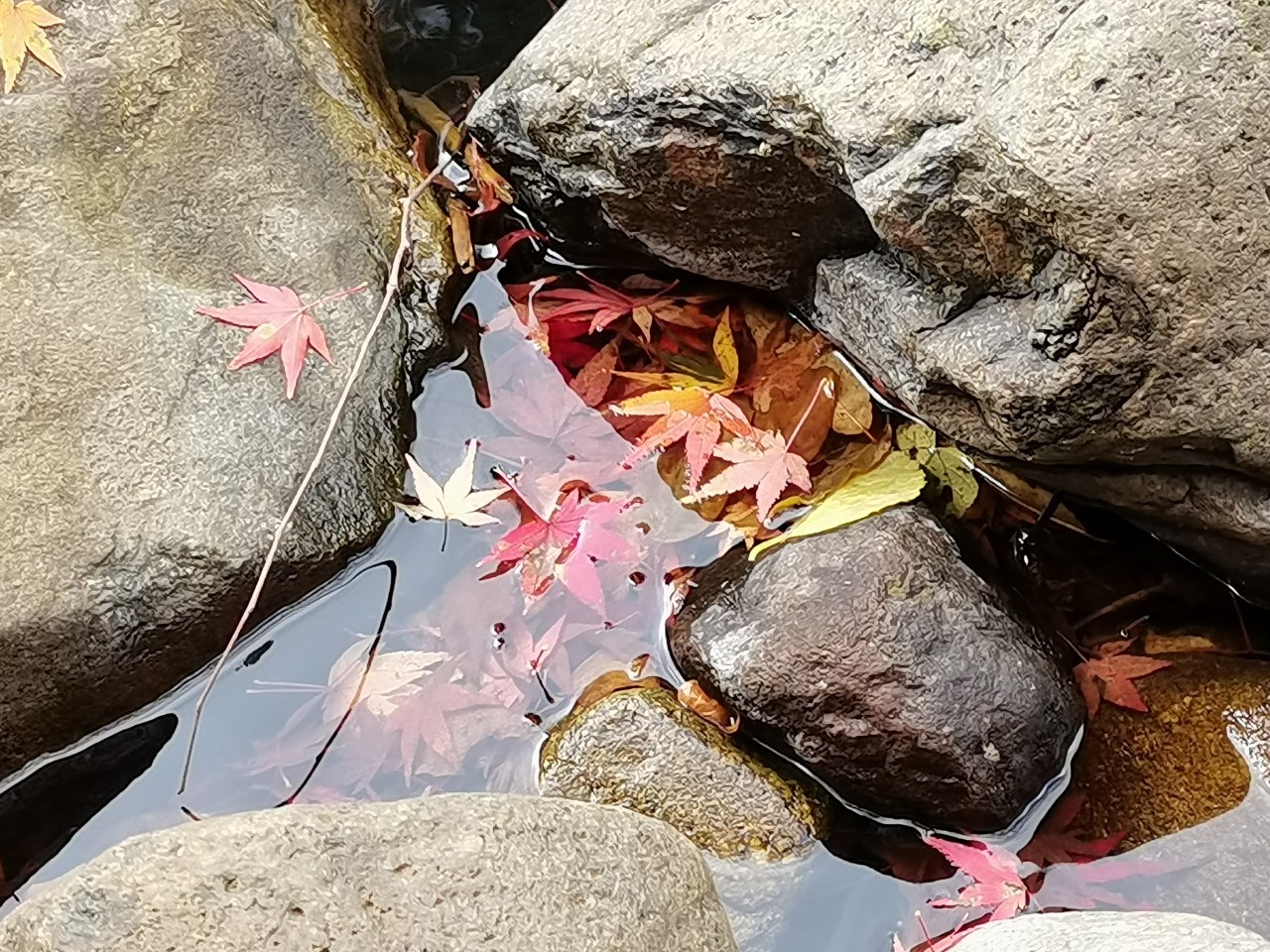 这里的路还算好走。有沿河的,不过部分封了,现在只有山侧的路。有时候要走些斜坡。我们在落叶下徒步很有意境。