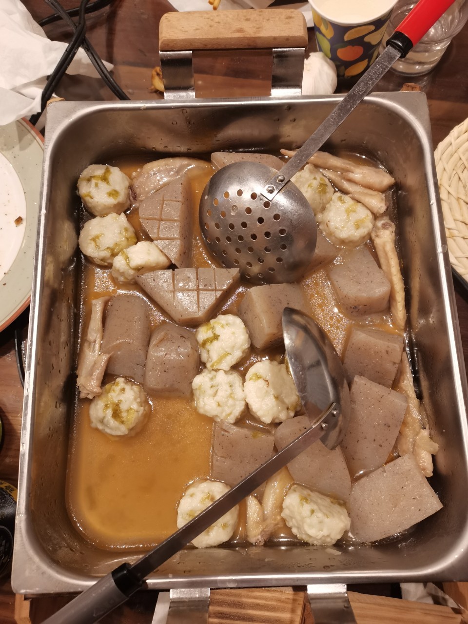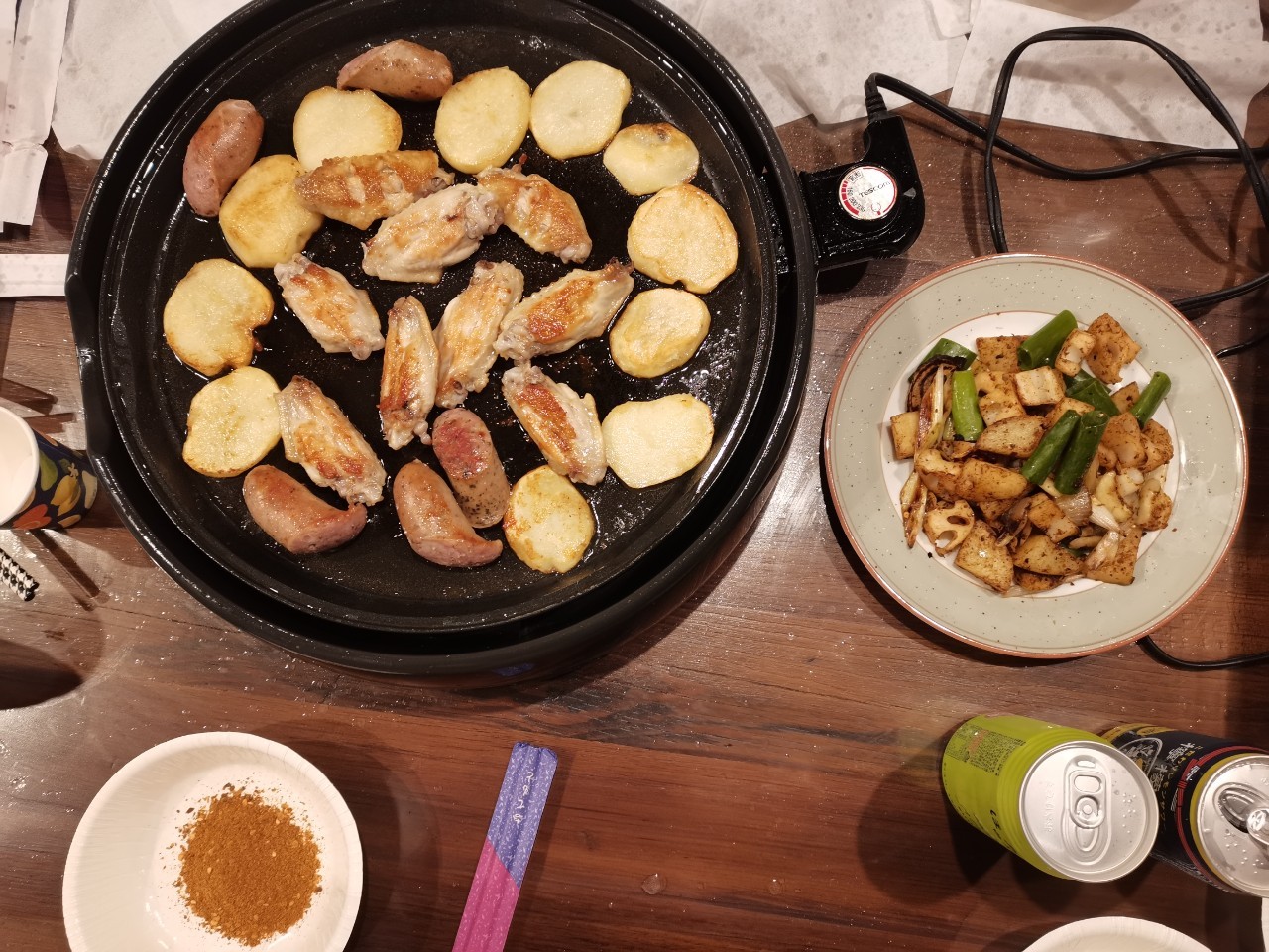 准备开锅,我们的烤鸡翅及炒藕,配沾水辣。