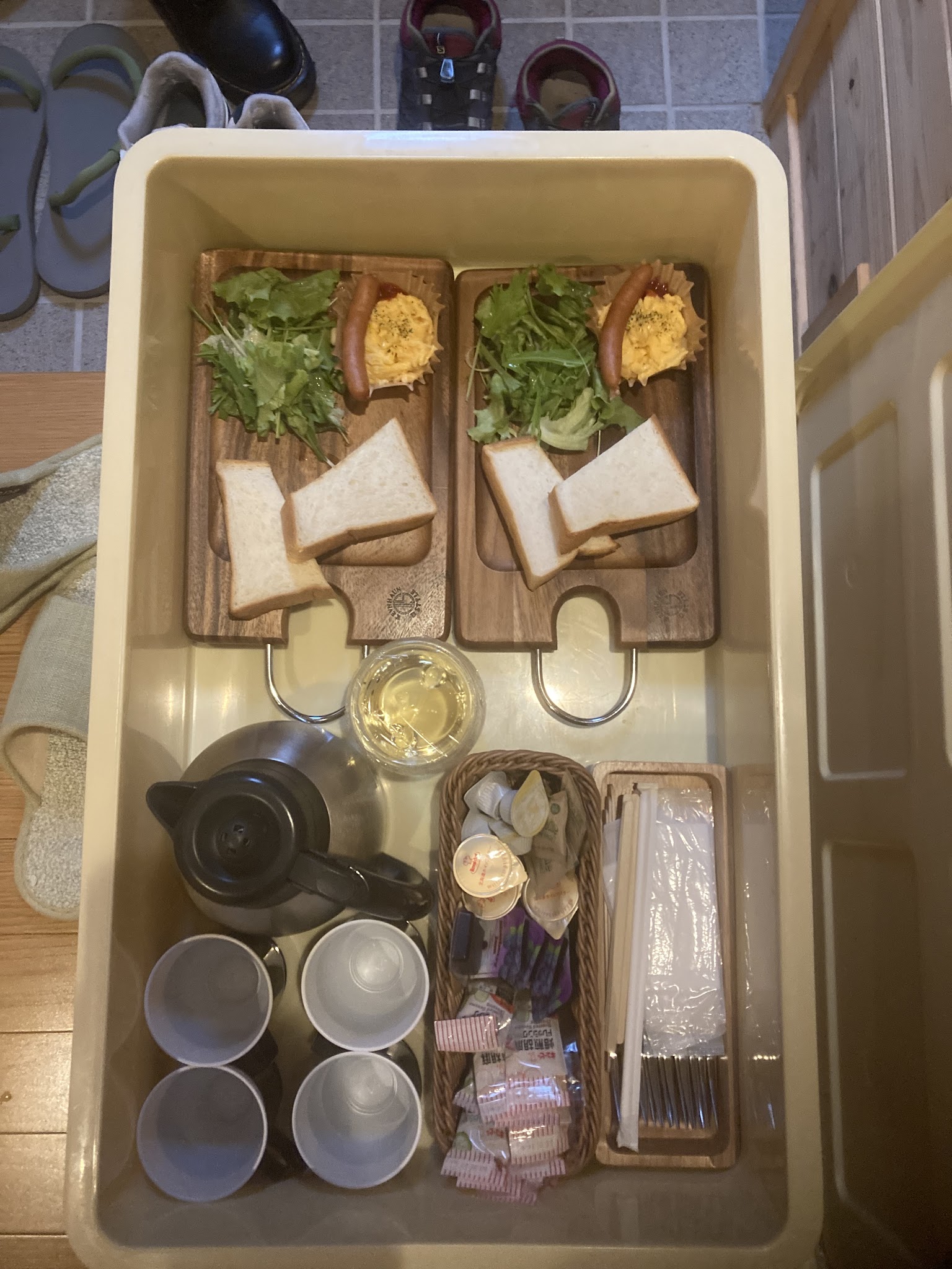 豪华小木屋竟然有很多塑料袋,给我们外卖用。下面就是我们最后打包走的,一人一盒随机分。