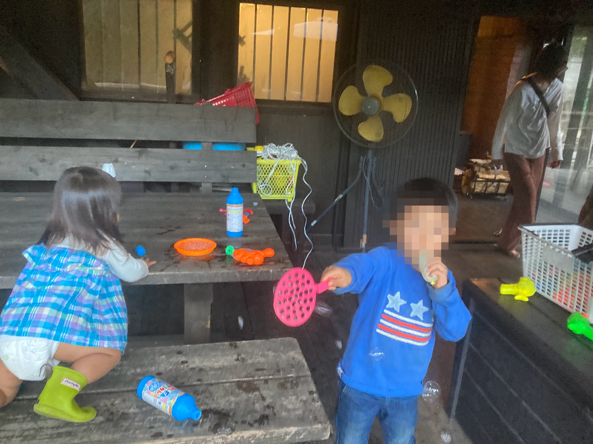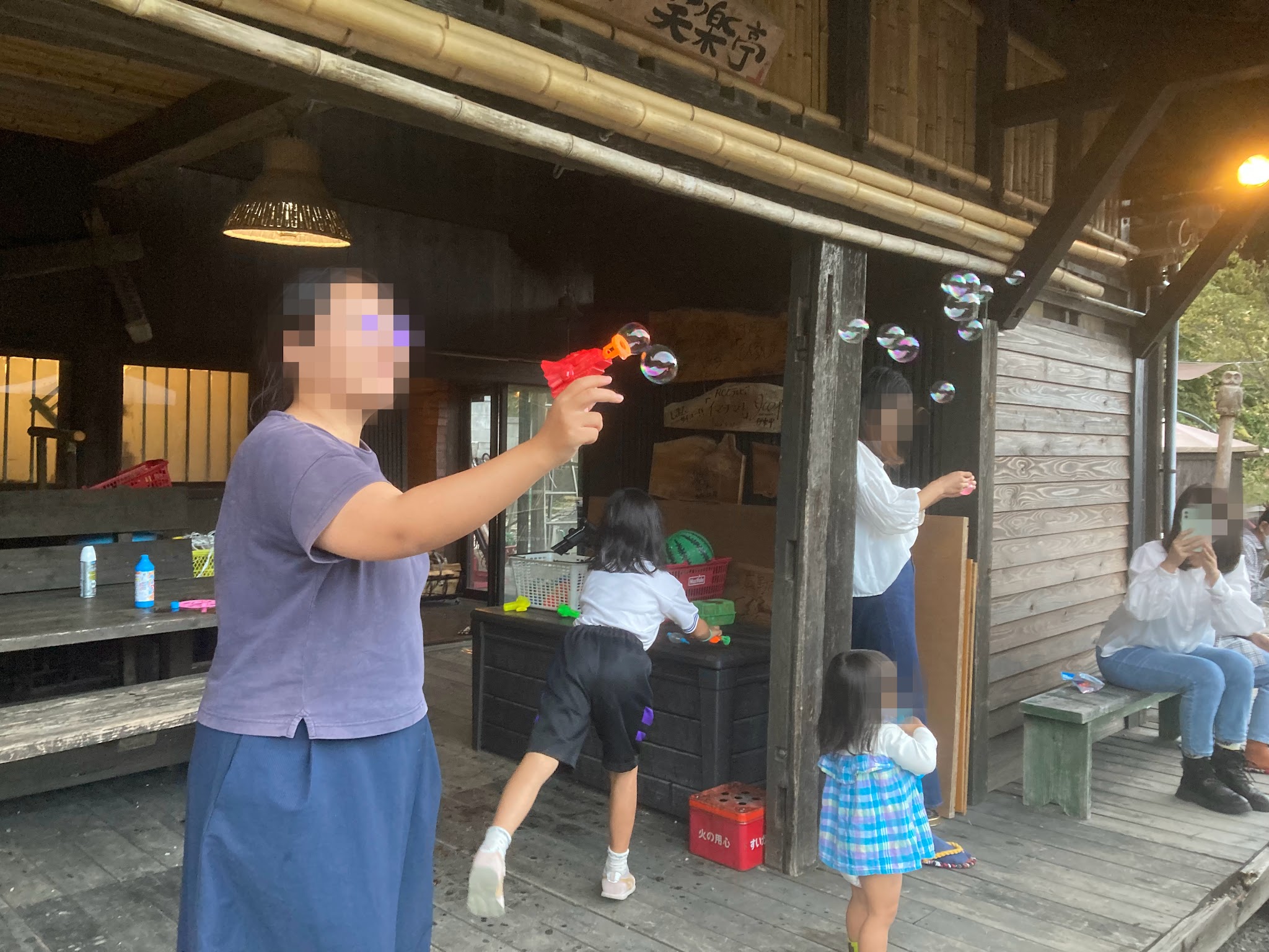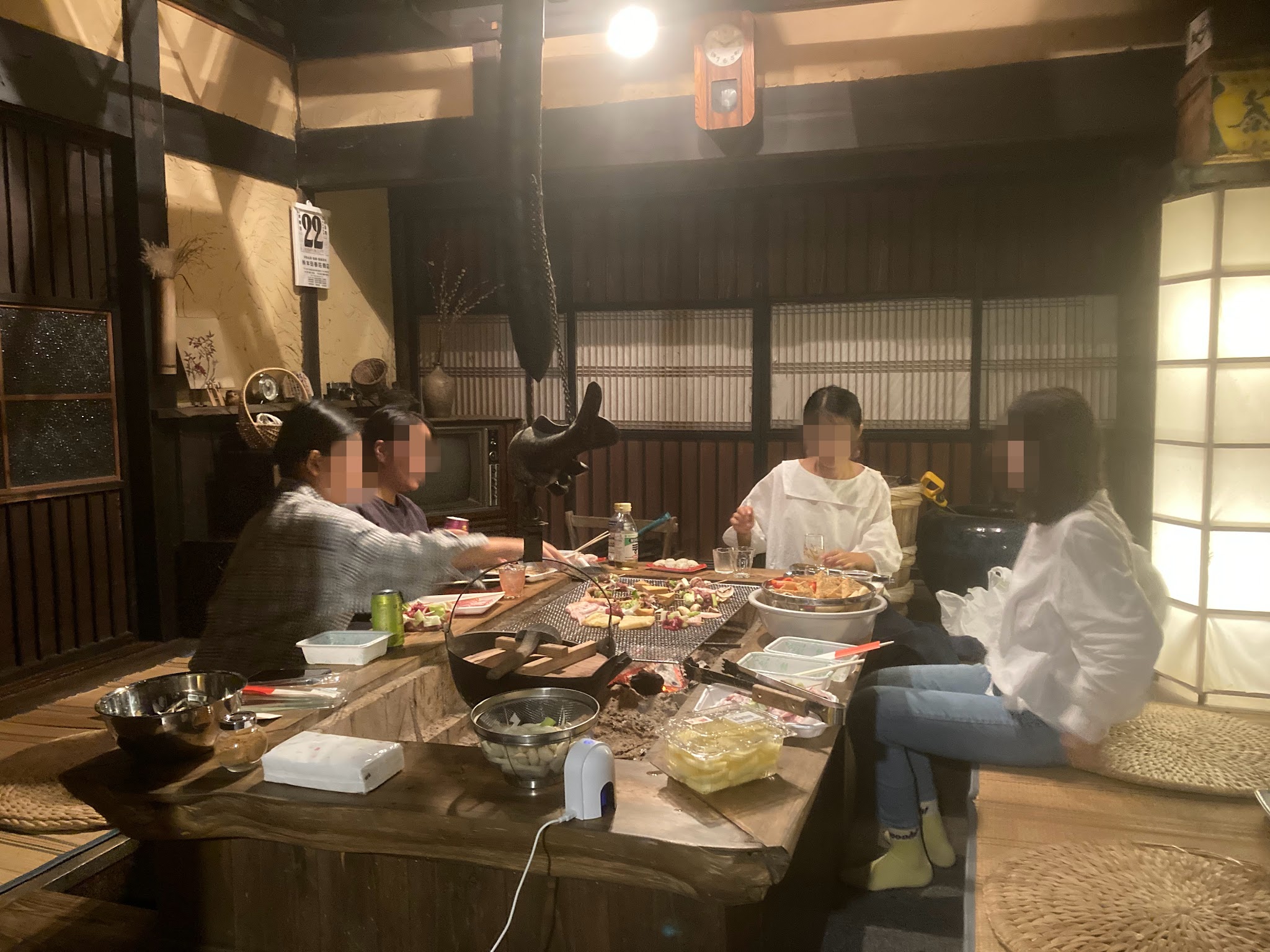 我们住的しまた能容纳最多10人,屋主花了10年时间改装,有两个温泉,还有秋千,吊床,跷跷板,囲炉裏,烧烤等。屋主还为小朋友准备了玩吹泡泡的东西,晚上还可以放烟火。厨房还有铁板,可以做お好み焼き,其他工具还包括かまど(农家烧柴做饭的工具),鯛焼き,章鱼小丸子等,一天绝对吃不完的。