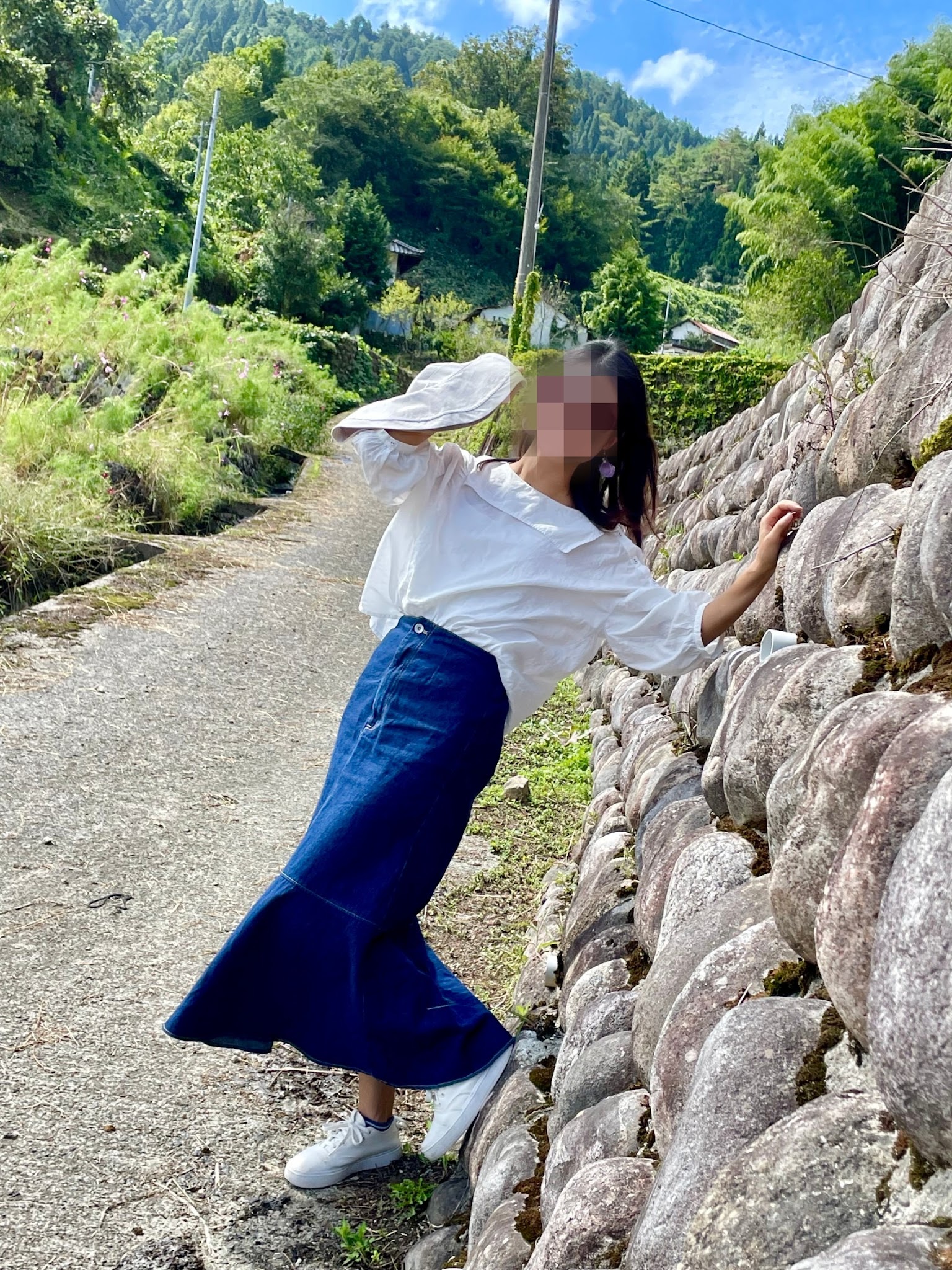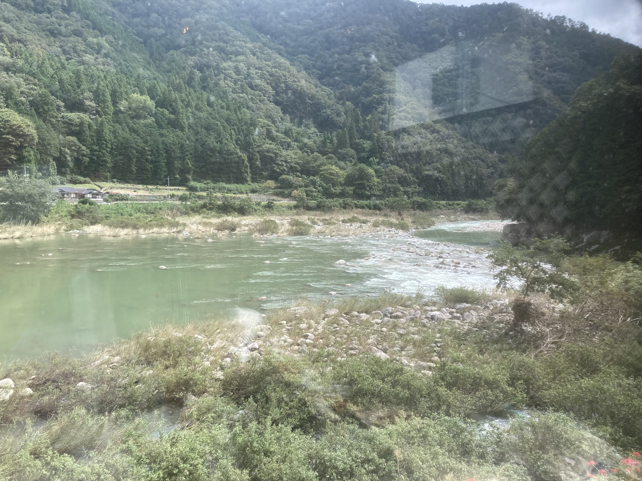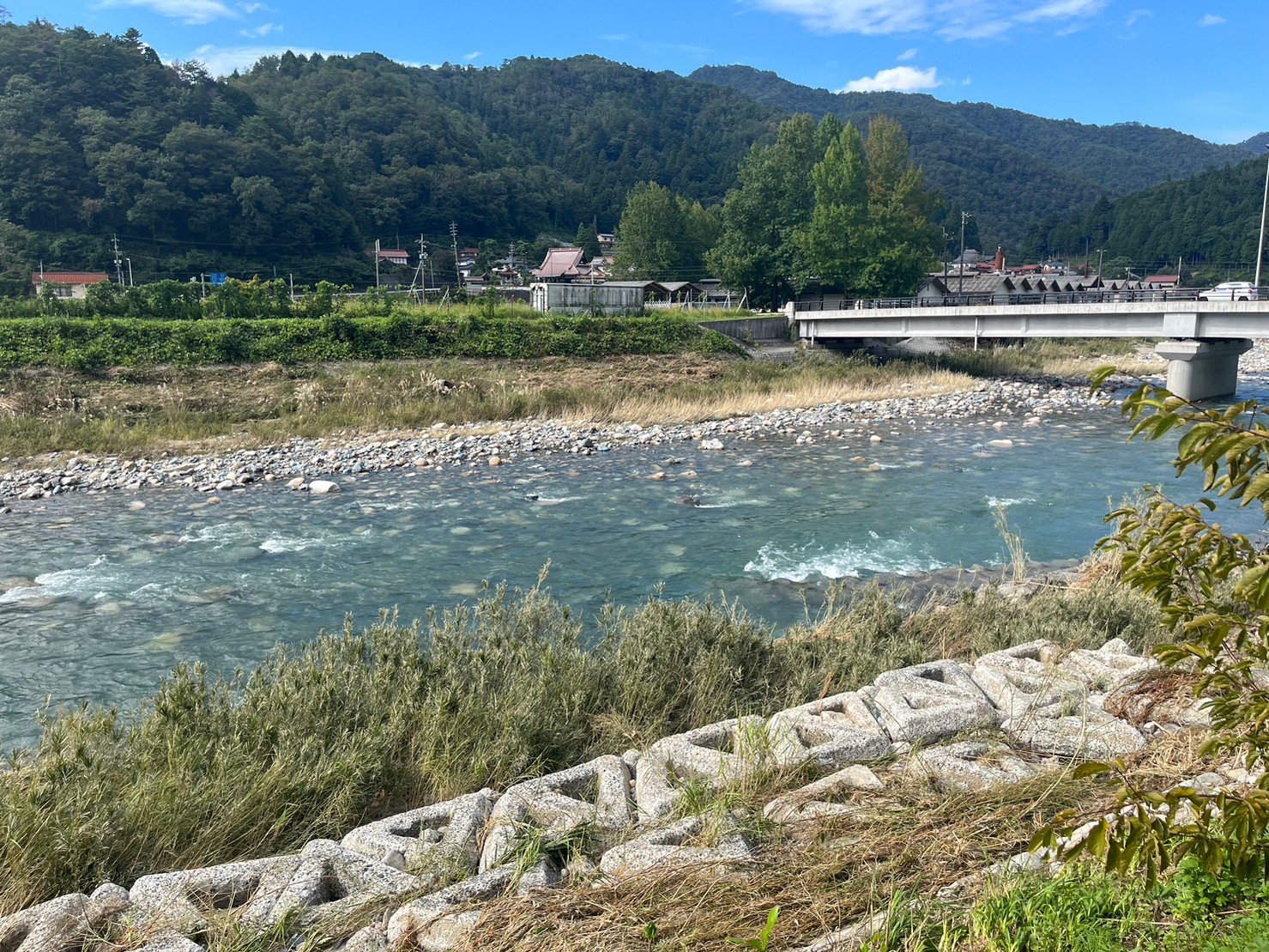 既然来到,就拍个照吧。这条水内川的香鱼毕竟是获奖的。这条河流确实清澈,好像海水一样的蓝色。