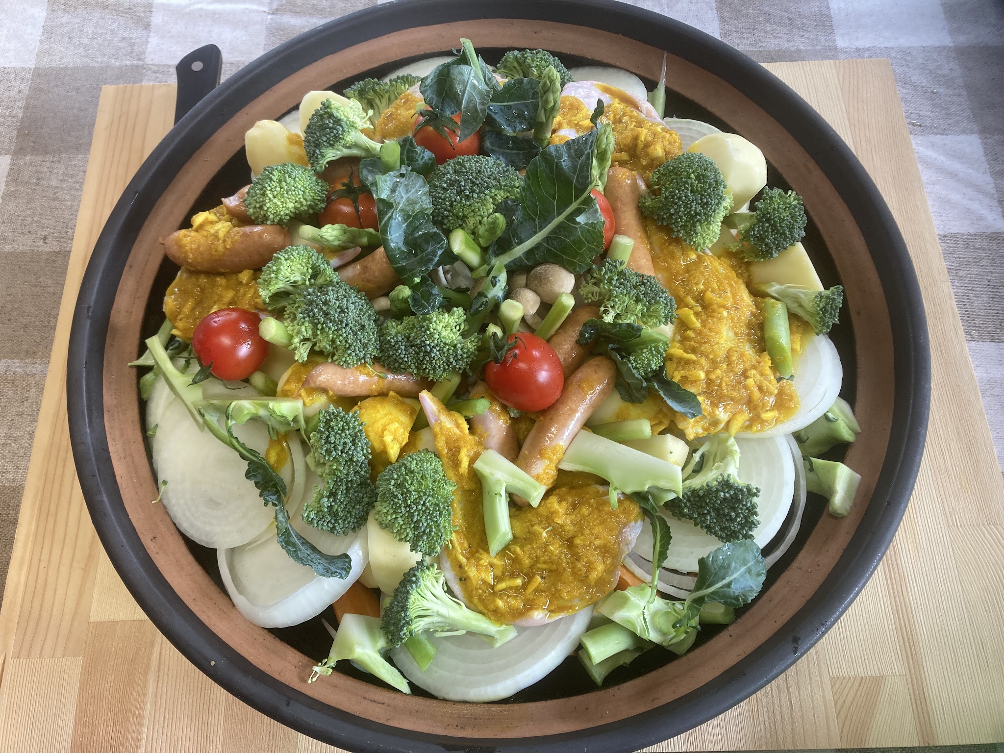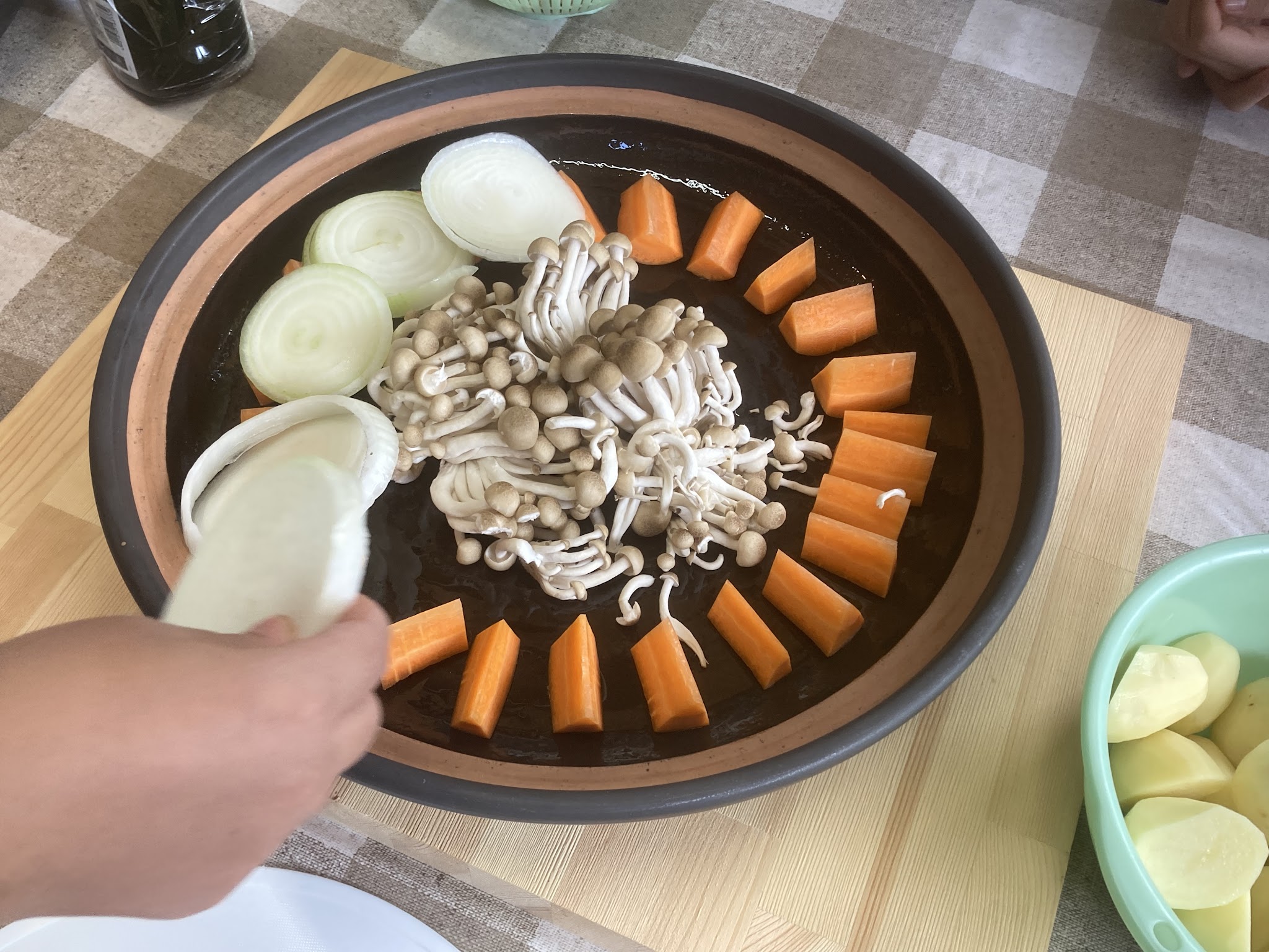 正式做饭前我来介绍一下这个锅。在加计曾经有个有摩洛哥经历的政府官员,回来后发现日本的塔吉锅(tagine,摩洛哥人用来做饭的锅,可以不加水的)不正宗。另一方面,摩洛哥本身的塔吉锅容易裂,所以他们就改良,加入了津巴布韦一种宝石粉末做这个锅(这个宝石粉末也用来做锂电池的),最后做成tatara锅。这个锅不用加水,慢煮,保留菜的原汁原味。如果你听说过法国的Staub也是这样,不过Staub能放烤箱,不能放微波炉,而tatara锅是可以的。