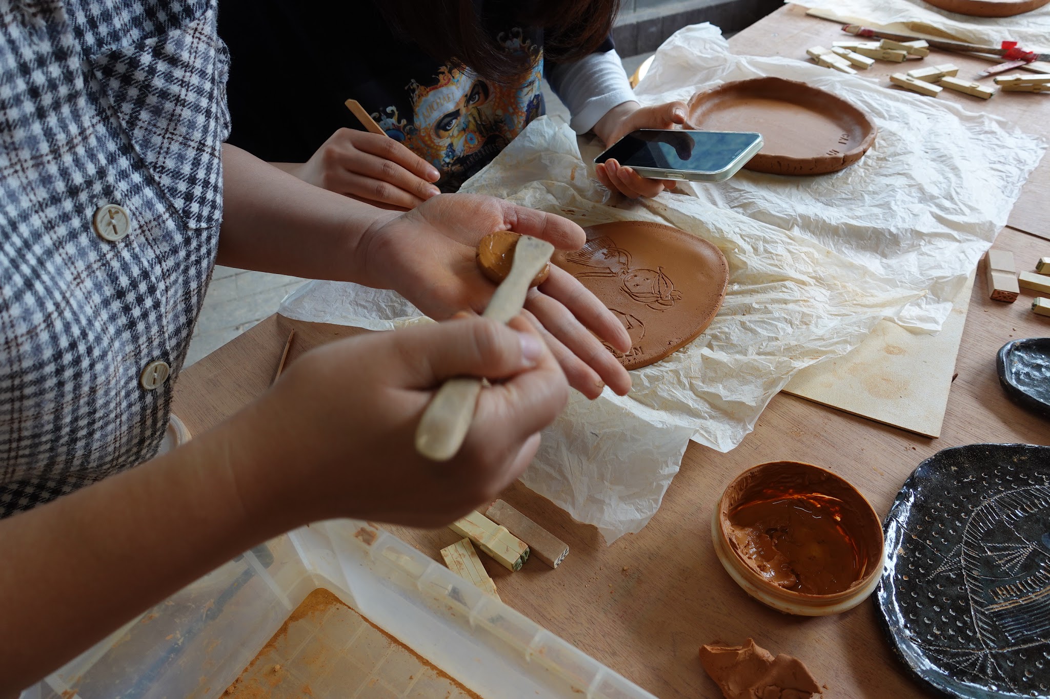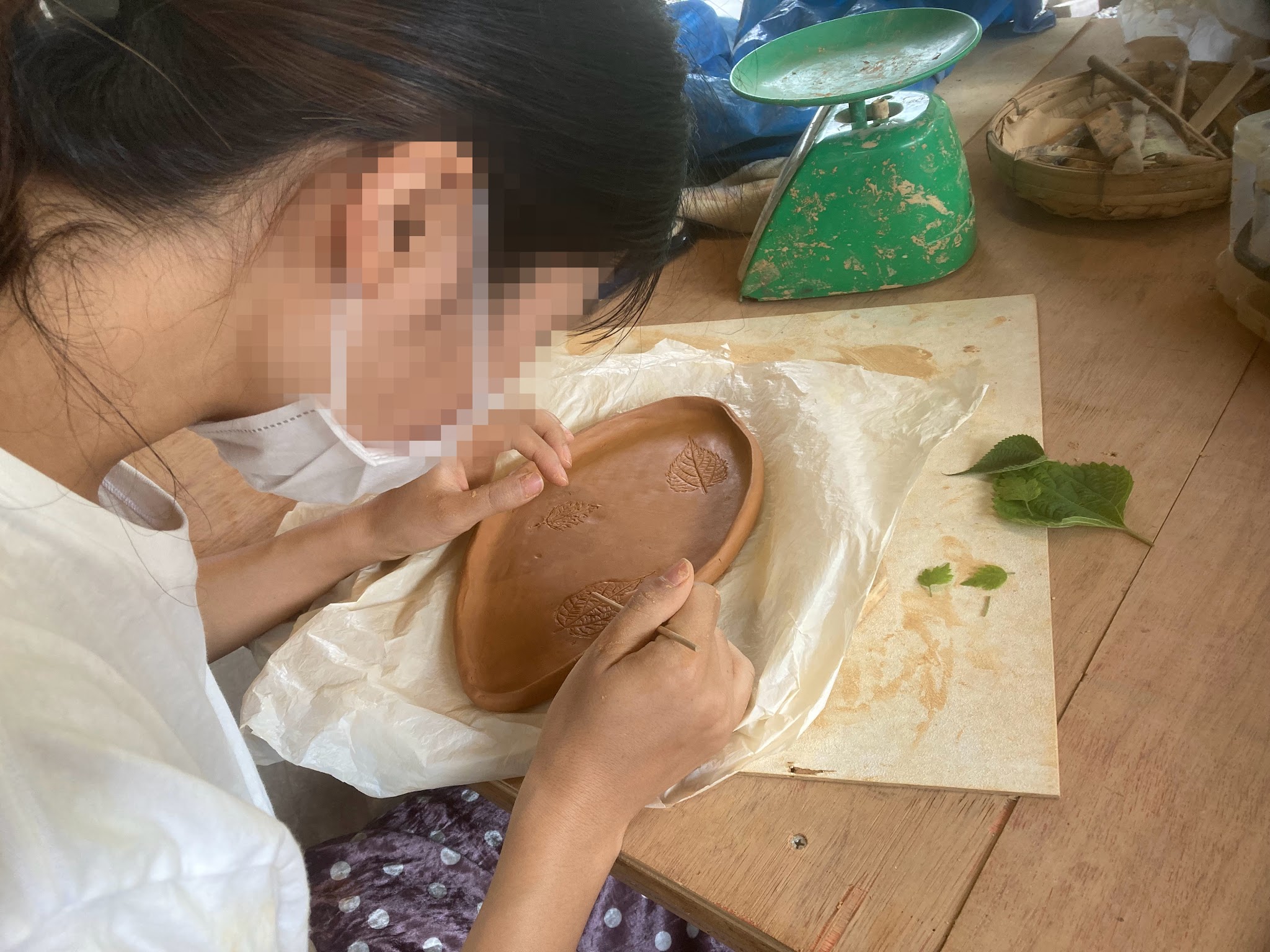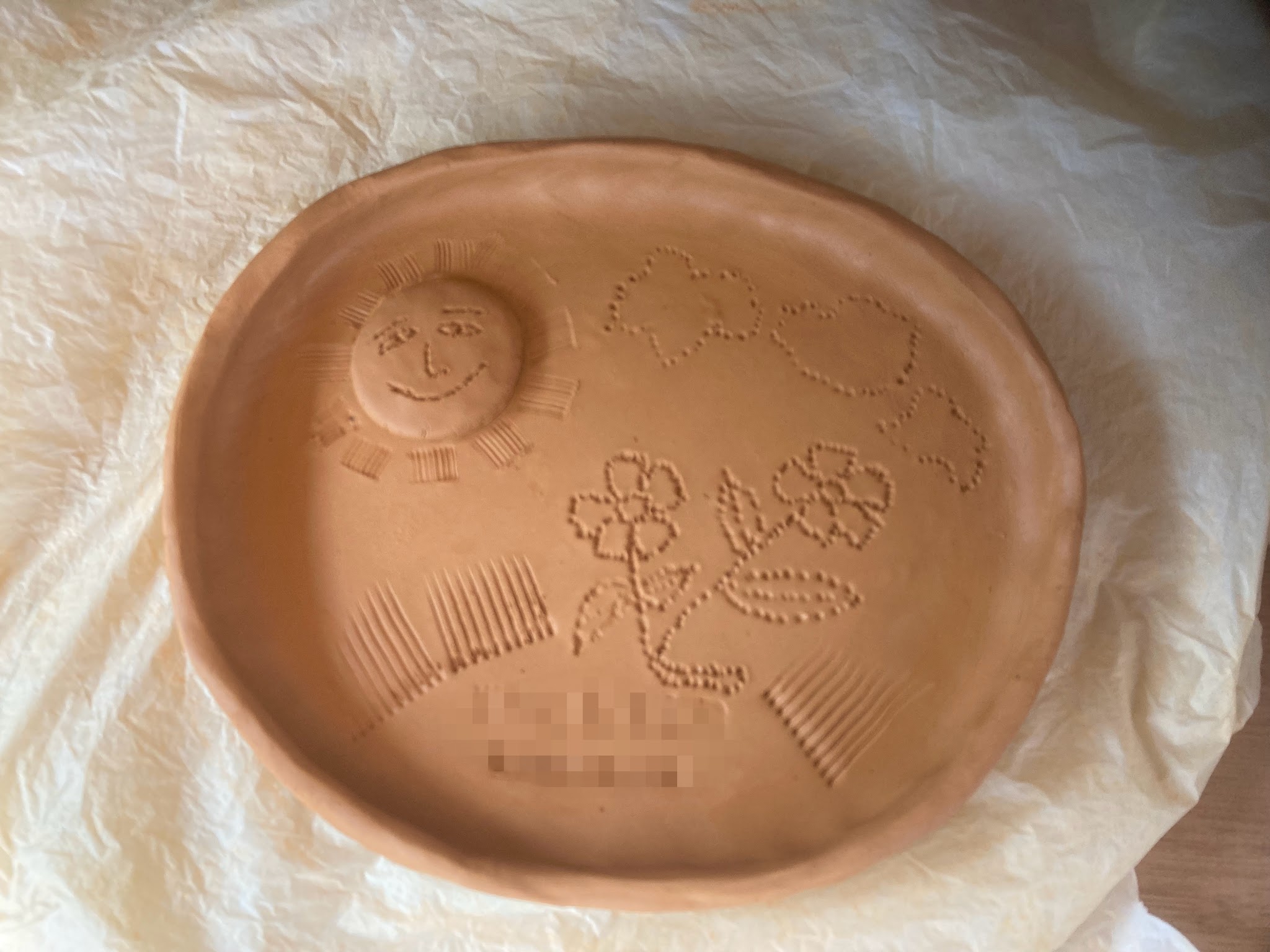 接下来,我们要开始陶艺了。盘最后烧出来什么颜色是根据天气会不一样的,这个天气大概是偏深蓝,但有时候会偏黑的。