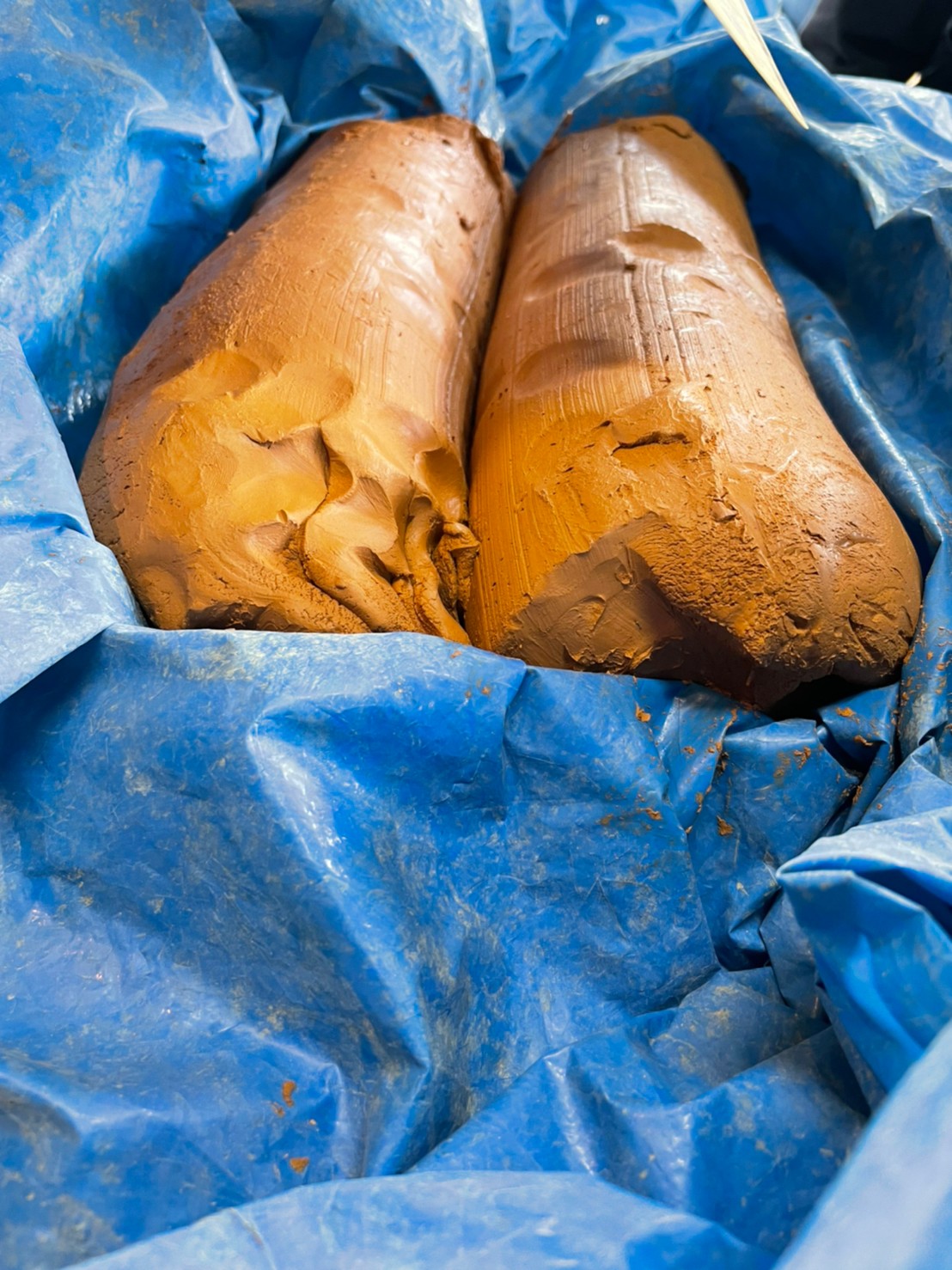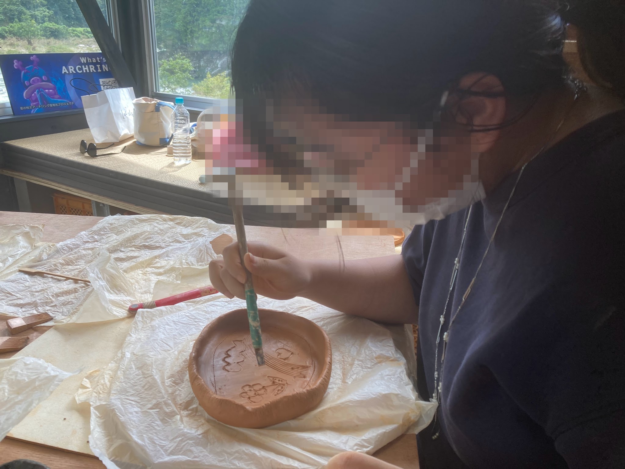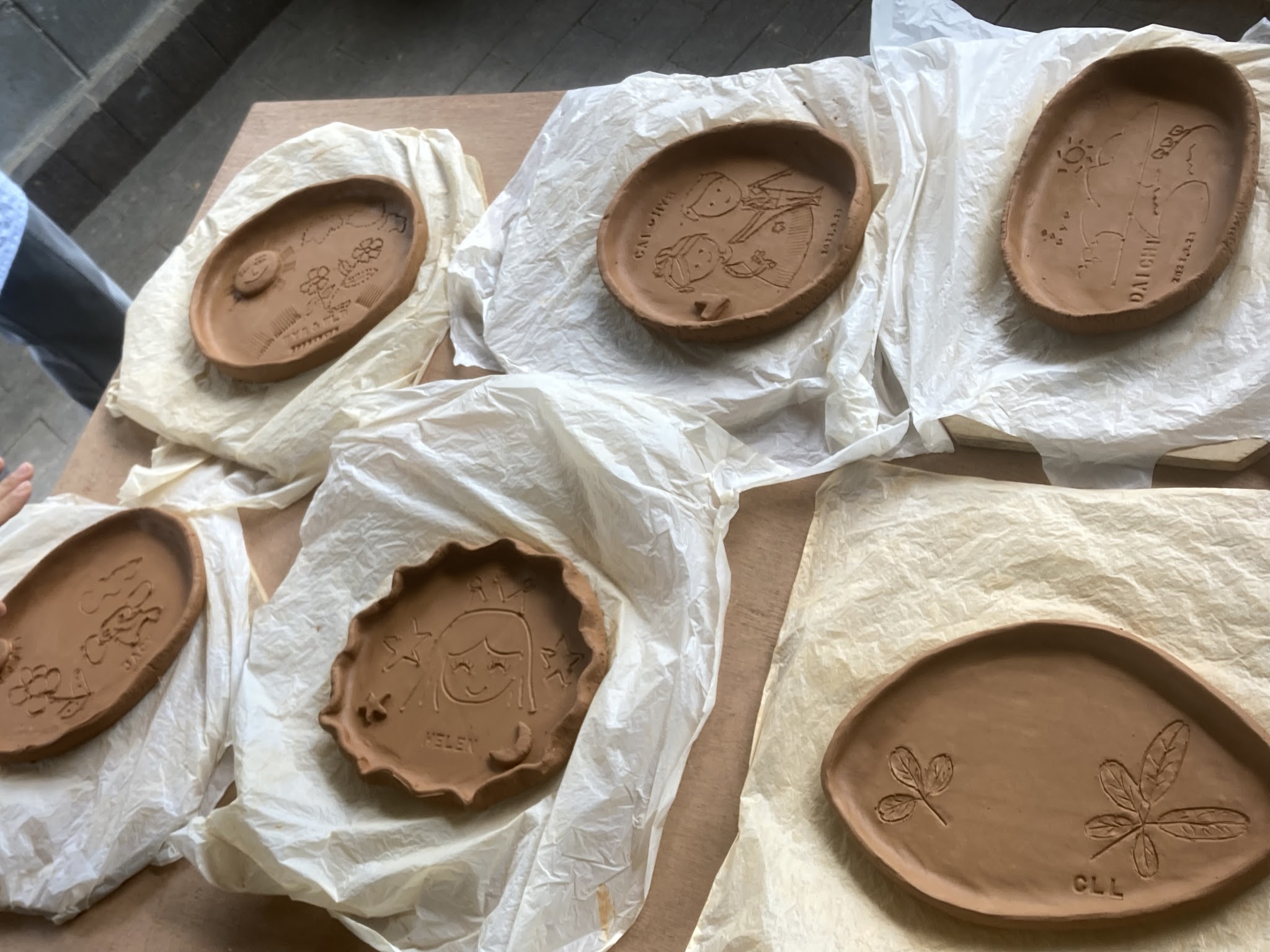 接下来,我们要开始陶艺了。盘最后烧出来什么颜色是根据天气会不一样的,这个天气大概是偏深蓝,但有时候会偏黑的。