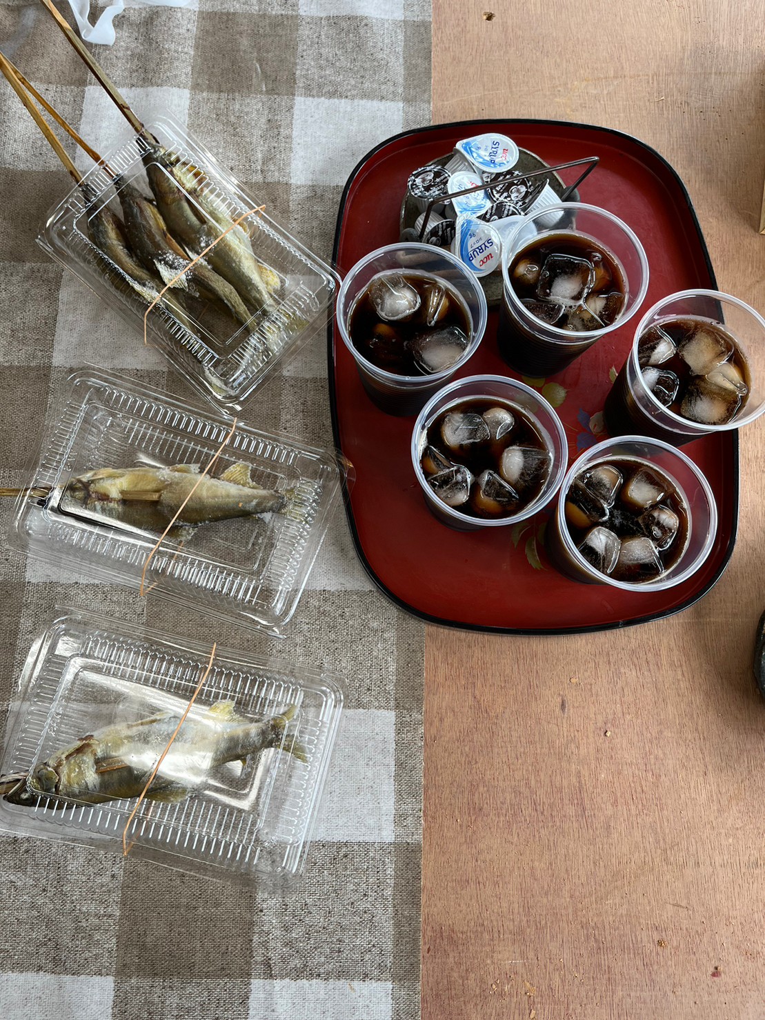 饭后还上咖啡,还有我们的香鱼也来了。当时还有段小插曲,送鱼的人算错了,差点收了我们1000一条呢。野生香鱼的肉质比起养殖的特别结实。