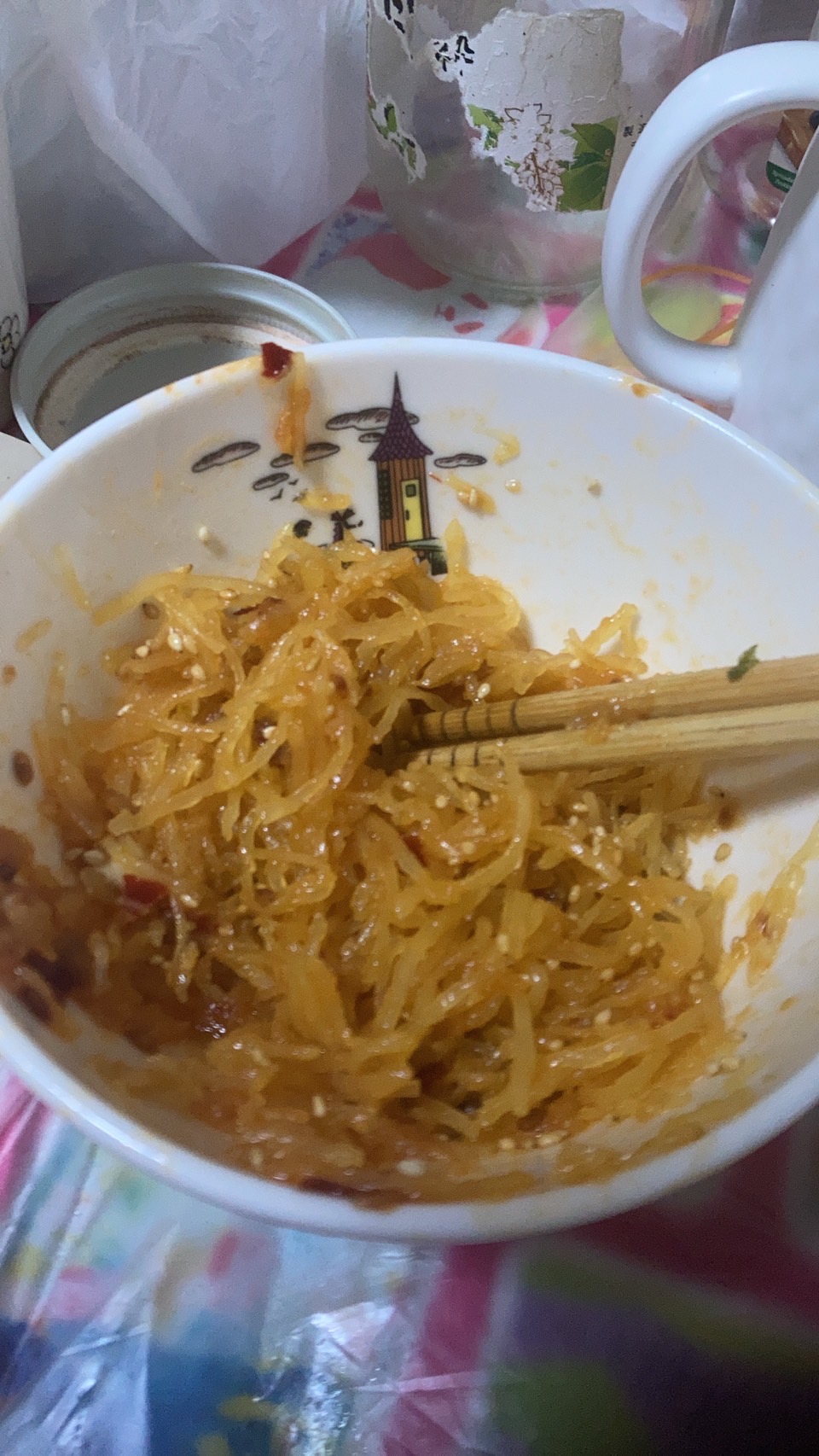 猜猜米饭上的是什么?是金丝南瓜,日语そうめんかぼちゃ,凉拌的。回去第二天我在本地超市看到,马上买了一个用日本菜谱试了,很好吃。