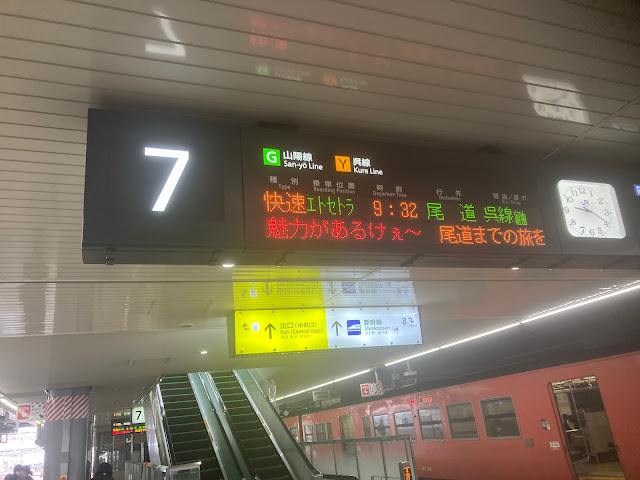 我们不到8点从家里出发,经过西条车站去广岛。车早9:32出发,在广岛站7号站台。电子告示牌会提别提示这是观光列车。