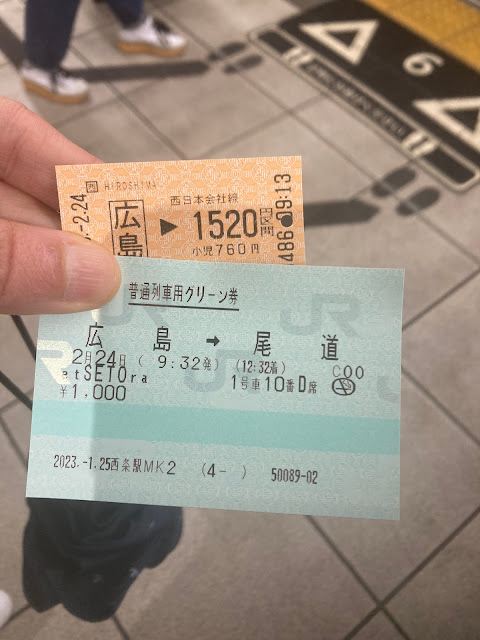 这趟列车只有两节车厢,周末挺不好买的,所以我们平时去。当日车上有空坐,不过海侧位置满了。提前一个月买票,我们2月24日的票,车站售票机是1月25日开始售卖。我选了两个最好的座位(预先看好官网座位表),是第1节车厢10A及10D。我买的グリーン(green)券,即额外坐这车需要的票,1000日元。另外加上普通广岛-尾道车票(1520日元,可以坐车时才买)。坐这趟车总成本2520日元。
